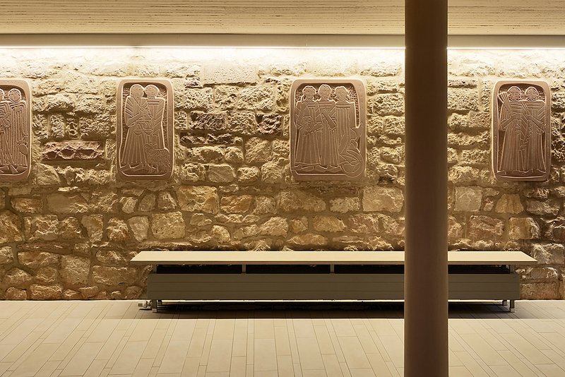 Charakteristisch für den Kircheninnenraum sind nicht nur die Stützen und Deckenflächen aus Sichtbeton, sondern vor allem die Wände aus Ziegelmauerwerk, die in ihrer Farbigkeit von gelb über orange bis rot reichen. Bei der Oberflächengestaltung und der Farbwahl neuer Materialien war somit vorrangiges Ziel, diese architektonischen Besonderheiten hervorzuheben. Als Konsequenz wurden alle neuen Einbauteile in ihrer Farbigkeit zurückgenommen. Die Auswahl der neuen Oberflächen wurde bewusst auf wenige Materialien beschränkt: Feinsteinzeug-Fliesen für die Bodenbeläge, Holz für Geländer, Schrankeinbauten und neue Bestuhlung. Die neuen Holzgeländer sowie Schrankeinbauten wurden passend zum Betongrau des neuen Feinsteinzeug-Fliesenbelags grau lasiert. In den neuen Kirchenbänken und Kirchenstühlen finden sich die gleichen Farbnuancen. Der Anbau einer neuen Sakristei ermöglichte die Erweiterung des Konfirmandensaals in Richtung Hof. Es entstand ein heller, freundlicher Raum mit großzügiger Verglasung zum neu gestalteten Innenhof.