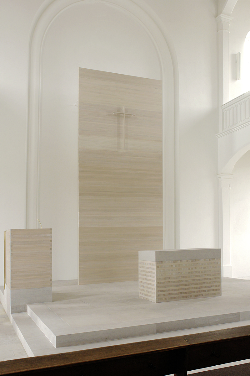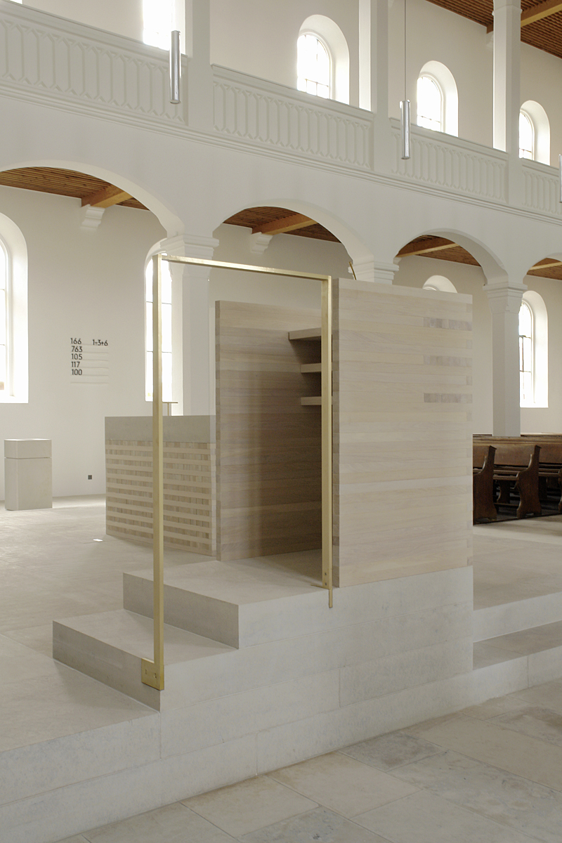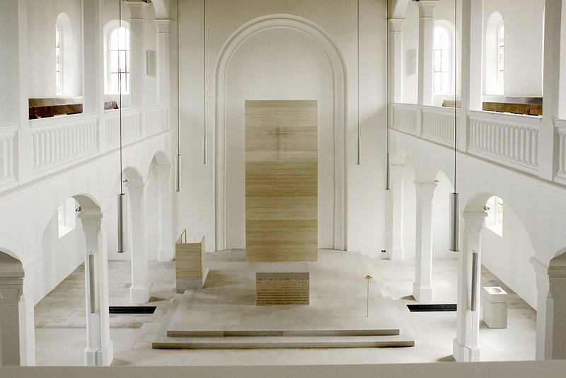 Um die Altarwand zu beruhigen, wurde das runde Fenster aus den 1960er Jahren wieder geschlossen. Der Bereich hinter dem Altar erhielt eine Wandscheibe, die den Sakristeieingang abdeckt und den Rückbereich fasst. Da die historischen Wandbekleidungen fehlen, wurden nach einem neuen Farb-Konzept alle Innenwandflächen weiß gestrichen. Pfeiler und Stützen mit ihren plastischen Details sind besser sichtbar und das Tageslicht mit seiner wechselnden Farbigkeit ist im Kirchenraum erlebbar. Der Altarbereich wurde von den Seiten gelöst und freier in den Raum gestellt. Er ist aus massiven Kalksteinplatten und -blöcken hergestellt, die ein steinernes Bodenrelief bilden. Der Altar besteht aus geschichteten Eichenstäben, die eine Kalksteinplatte tragen. Die Prinzipalstücke sind ebenfalls aus massivem, gekalktem Eichenholz geschichtet und gefügt. Der Taufort besteht aus Kalkstein. Der Aufbau und die Fügung der neuen Ergänzungen sind einfach und unmittelbar nachvollziehbar. Der Raum ist mit Materialien ergänzt, die ursprünglich verwendet wurden: Stein, Holz und Messing.