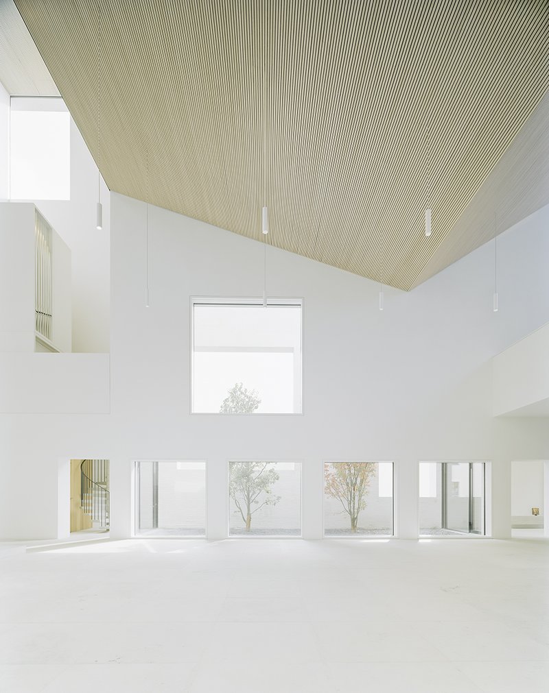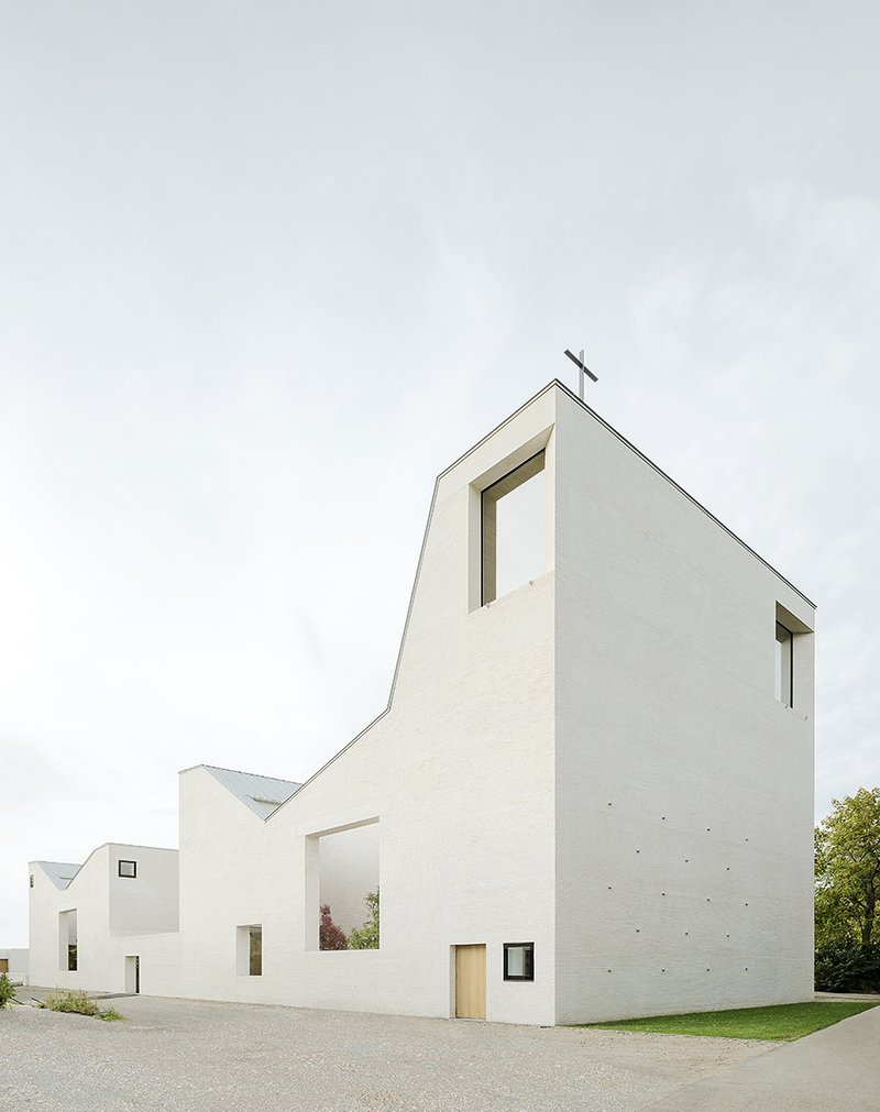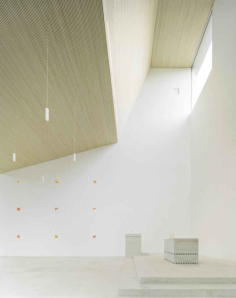 Die Gemeinderäume sind offen gestaltet und können über Raumblöcke mit Nebenfunktionen umgangen und untereinander erschlossen werden. Dem eher geschlossenen Äußeren stehen lichte und offene Innenbereiche mit natürlichen Materialien wie Stein und Holz gegenüber. Die ruhigen und dennoch spannungsvollen Raumfolgen sollen Ort für ein lebendiges und vielfältiges Gemeindeleben werden.
