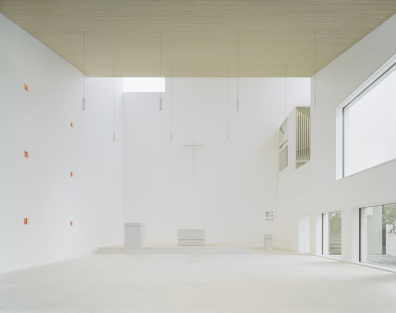 Die geneigten Dachflächen schließen den Kirchenraum nach oben ab und geben ihm seine charakteristische Raumgestalt. Der Kirchenraum hat einen eindeutig sakralen Charakter mit einem deutlich erhöhten Lichtraum über dem Altarbereich, der von einer Fensterfläche im Osten und von einer Fensterfläche im Süden belichtet wird. Der Lauf des Tageslichts bestimmt die Lichtstimmung im Kirchenraum. Der Kirchenraum öffnet sich seitlich zu einem Gartenhof hin, der Teil eines Raumbandes ist, das Kirche und Gemeindehaus verbindet und als eine Art Distanzzone nach Süden hin zur Wohnbebauung ausgebildet ist. Dieses Raumband wird durch eine Abfolge von Räumen mit besonderen Nutzungen gebildet, wie beispielsweise einem kleinen Andachtsraum und dazwischen liegenden, mit Ahornbäumen bepflanzten Gartenhöfen. Dabei bildet die Sakristei als dienender Raum der Kirche den Abschluss im Osten und die Küche als dienender Raum des Gemeindehauses den Abschluss im Westen.