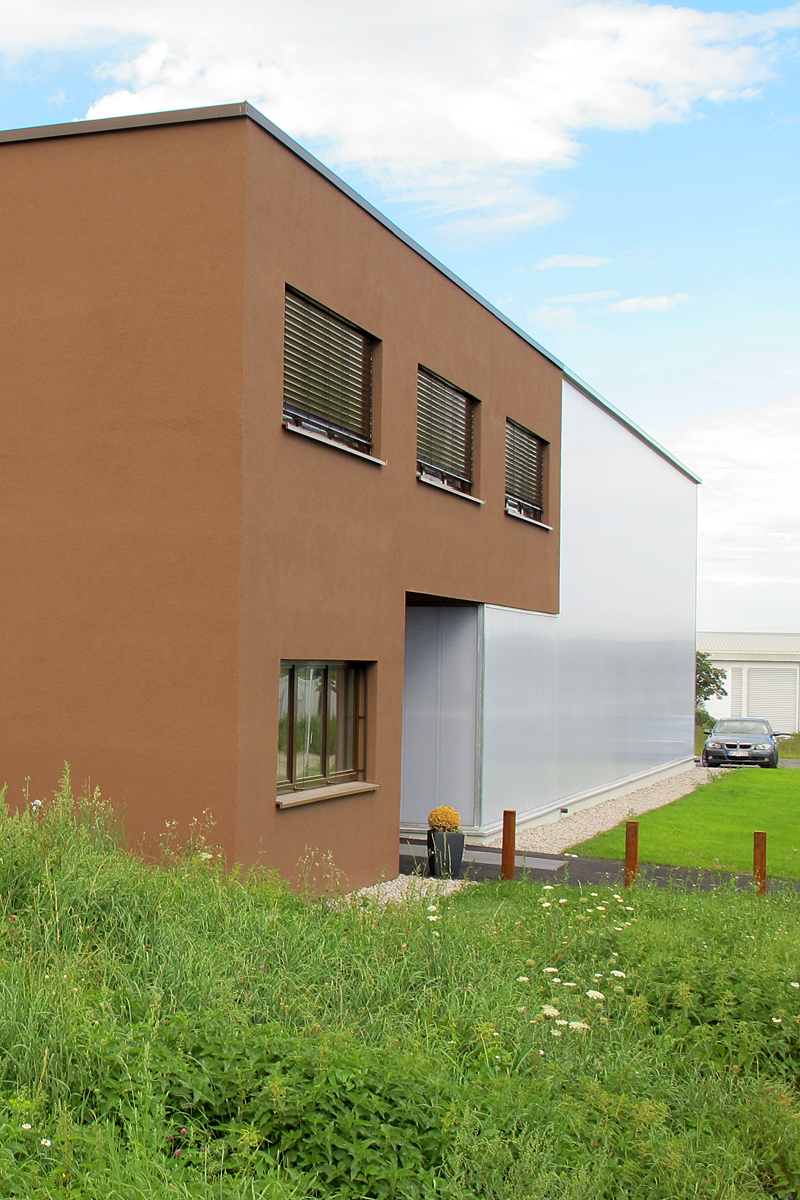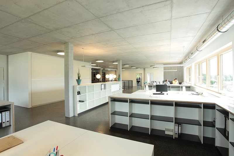Der Neubau des überregional tätigen Handwerksbetriebes für nachhaltige Gebäudetechnik schafft den angemessenen Raum für die neue Firmenzentrale im strategisch günstig gelegenen Kirchheimer Industriegebiet Kruichling. Ein Verwaltungstrakt und eine Lager- und Vorkonfektionierungshalle verschränken sich, als eigenständige Baukörper ablesbar, zu einem schlichten Gesamtgebäude. Durch die Verzahnung der beiden präzise ineinandergefügten Baukörper konnte nicht nur die innere Funktionalität verbessert werden, sie steht auch sinnbildlich für die enge Vernetzung der Planungs- und Ausführungskompetenz des innovativen Betriebes. Folgerichtig dient auch das Energiekonzept der eigenen Firmenzentrale als Beispielobjekt nachhaltiger Gebäudetechnik: Eine Bauteilaktivierung nutzt das Speichervermögen der Betondecken und gewährleistet neben der Beheizung im Winter auch die sanfte Klimatisierung des gut gedämmten Gebäudes im Sommer. Über Erdsonden und eine Sole-Wärmepumpe wird das Erdreich nicht nur als Energiequelle, sondern auch als jahreszeitlicher Speicher genutzt. Der notwendige Luftaustausch des Gebäudes wird über eine Lüftungsanlage mit hocheffizienter Wärmerückgewinnung und Vorkonditionierung über den Energieaustausch mit dem Erdreich gewährleistet.