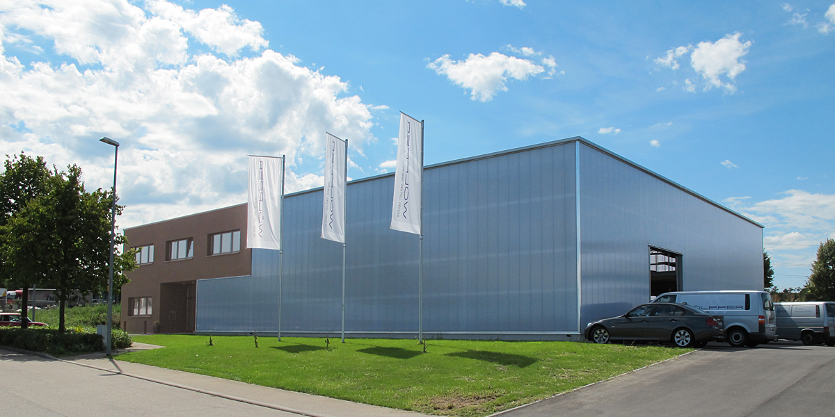 Obwohl die mit einer transluzenten Polycarbonatfassade versehene Lagerhalle teilweise über zwei Ebenen organisiert ist, schafft der Innenraum durch die erstaunliche Tageslichtausleuchtung eine angenehme Arbeitsatmosphäre. Der sich in Materialität und Farbgebung deutlich davon absetzende Verwaltungsbereich ist ebenfalls über zwei Geschosse organisiert und auf beiden Ebenen funktional mit dem Lagerteil verknüpft. Im Inneren empfängt den Besucher ein großzügiger, die Geschosse verbindender Luftraum als zentrales organisatorisches Element und damit gleichzeitig als kommunikativer Mittelpunkt des Hauses. Das robuste und effiziente architektonische Gesamtkonzept geht von der Außenhülle bis zum Schreibtisch. Nicht nur der gesamte Ausbau bis hin zu den einzelnen Arbeitsplätzen wurde individuell entworfen, auch auf jeden einzelnen Sanitärraum wurde im Sinne der Musterausstellung ein eigenes, individuelles Konzept abgestimmt.