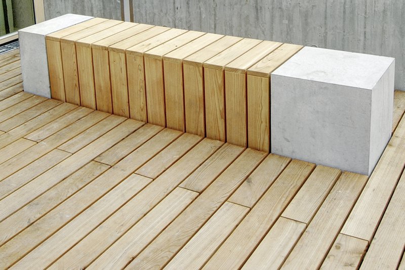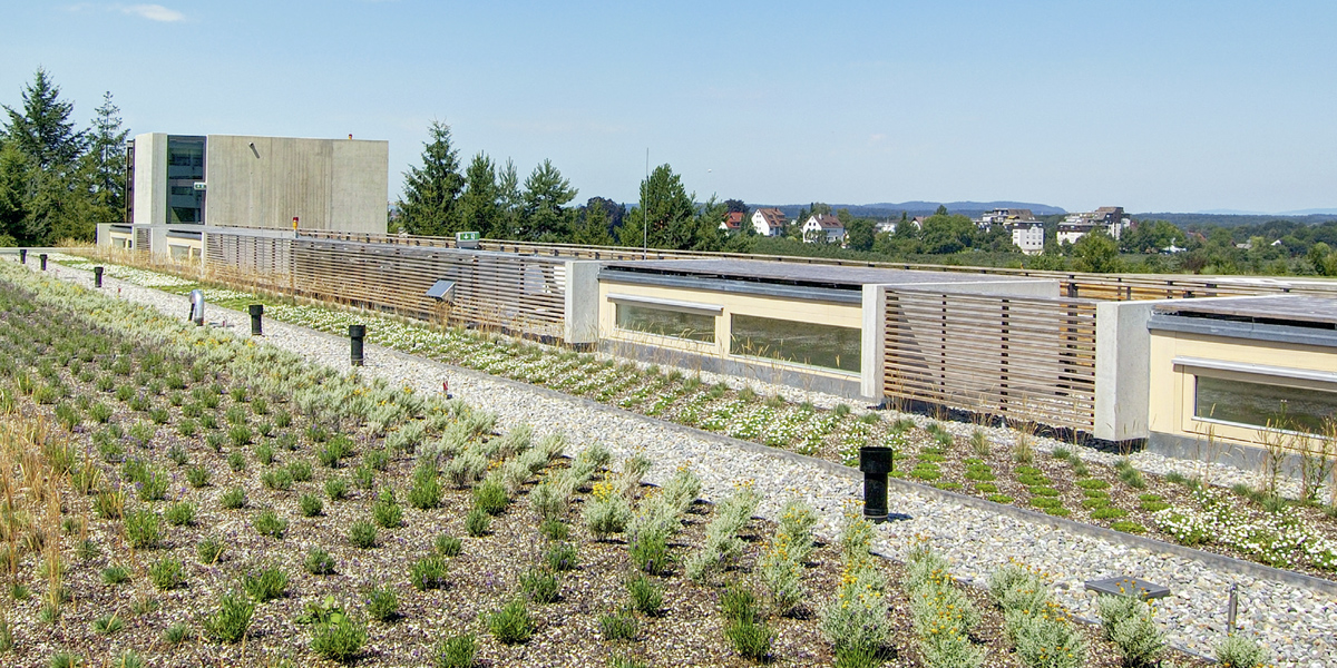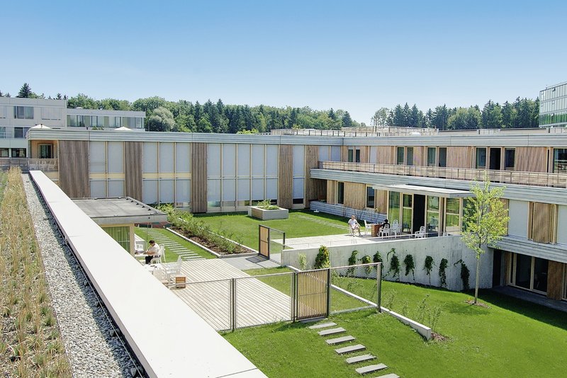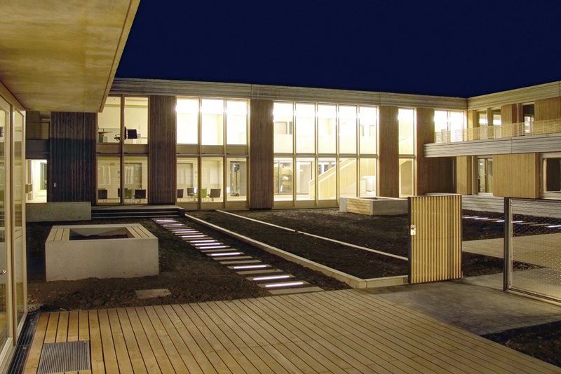 Im Osten des Neubaus liegt als Scharnier zum Krankenhaus Friedrichshafen ein großzügiger Vorplatz. Er fokussiert die Erschließung und ist mit Baum überstandenen Sitzbereichen für Patienten, Beschäftigte und Besucher gefasst. Holzterrassen sowie wechselnde Kies-, Bodendecker- und Lavendelstreifen formulieren für das Zentrum für Psychiatrie eine ästhetisch wie ökologisch signifikante Dachlandschaft. Eine indirekte Außenbeleuchtung unterstreicht die Ruhe der Gesamtkonzeption.