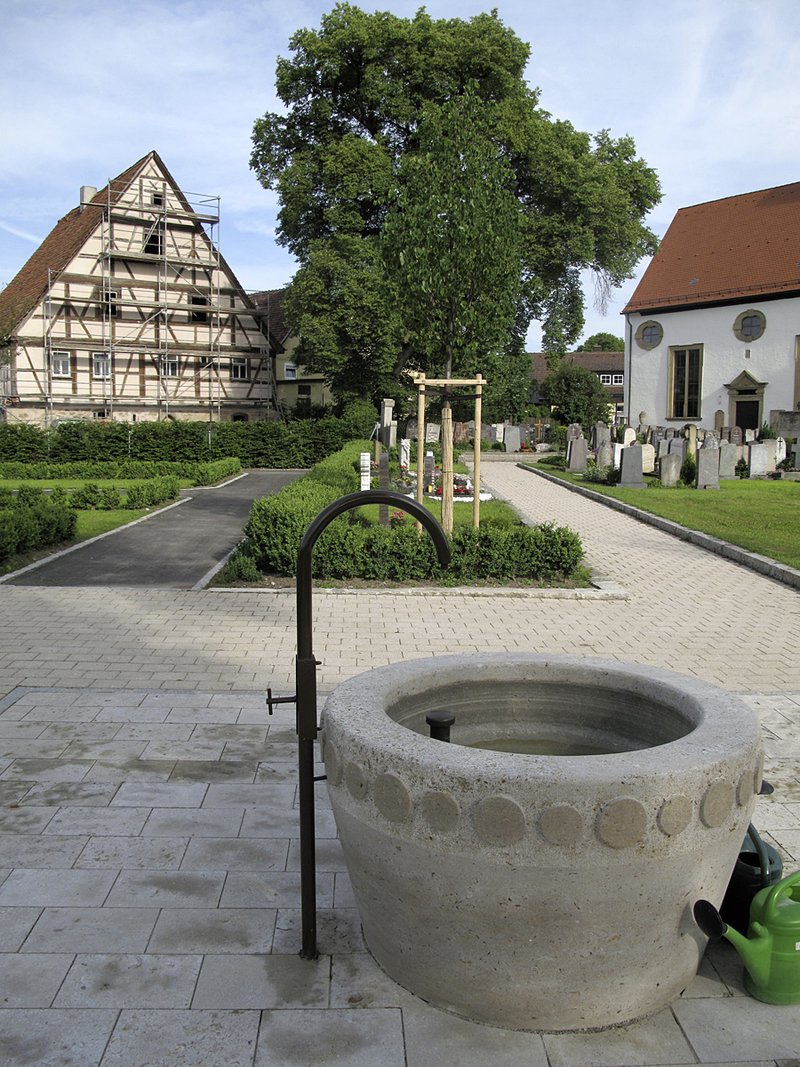 Bindeglied zwischen Alt und Neu ist ein nach Werkzeichung angefertigter Monolithbrunnen - Material Muschelkalk.