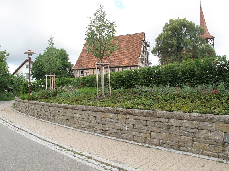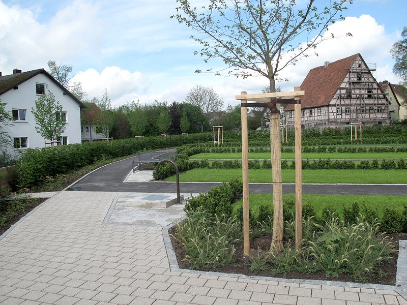 Das Steinmaterial für Mauern wie auch für Plätze kann nur aus heimischem Muschelkalk sein. Satteldorf hat weit über Deutschland hinaus ein bedeutendes Natursteinwerk. Wenn noch zwei Jahre vergangen sind, wird eine bunter Staudenrabatte - überstellt von Winterlinden - die Wolfsgasse begleiten.