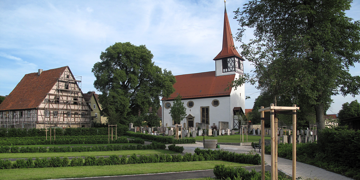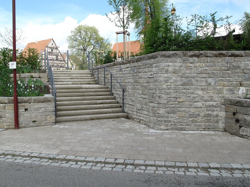 Ohnen einen weiteren Zugang zum Gesamtfriedhof über die Wolfsgasse wäre der östliche Ortsteil "abgehängt". Mit einer großzügig gestalteten Treppenanlage Muschelkalkstützmauer ist ein respektvoller Aufgang entstanden. Zumal die Friedhofsbesucher immer die Kirche im Blickfeld hat.