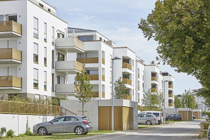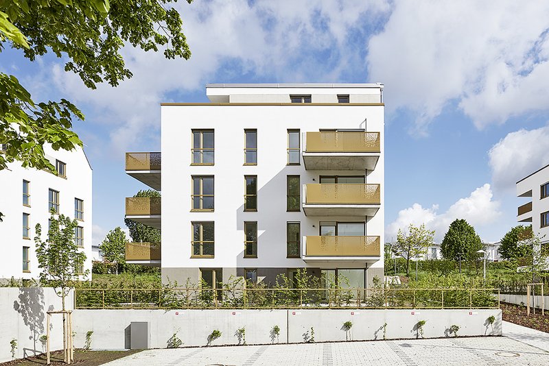 Die Gebäudeversätze der Mietwohnungsbauten tragen zur Gliederung der Baukörper und Fassaden bei. Die hellen Putz-Flächen werden mit farbig strukturierten Bereichen in Sockel- und Dachgeschosszone unterteilt. Durch eine unterschiedliche Ausformulierung der Balkon- und Eingangselemente (gestanztes Blech bzw. Streckmetall) werden die Gebäude als individuelle Häuser ablesbar. Die pragnante Farbgebung der Fenster und Metallelemente schafft eine Identitatsbildung mit hohem Wiedererkennungswert.