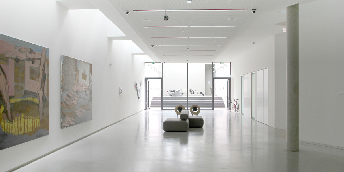 Der Grundriss erlaubt es, auf allen Ebenen differenzierte außen- und innenräumliche Beziehungen herzustellen und die vielfältigen Raumfolgen erlebbar zu machen. So öffnet sich bereits vom Foyer, über die Ausstellungseben, der Blick in den Garten. Durch die Führung des Tageslichts bis auf die Untergeschossebene entstehen unterschiedlich ausgeleuchtete Raumzonen, die den besonderen Anforderungen der jeweiligen Exponate - Malerei und Plastik - gerecht werden. Besonders geeignet für eine zugleich außenwirksame Ausstellung größerer Plastiken sind die beiden „Stadtfenster“. Der Werkstattcharakter, den die weiß gestrichenen Wände und Decken sowie die grauen Estrichfußböden anklingen lassen, ist auch für das Nutzungskonzept der Galerie Programm. Für eine markante, stadtbildliche Präsenz sorgt eine flächige Beleuchtung der offenen Fassadenteile in der Nacht und dunklen Jahreszeit.