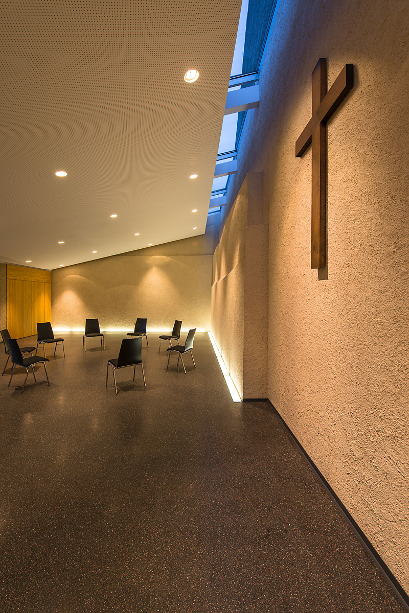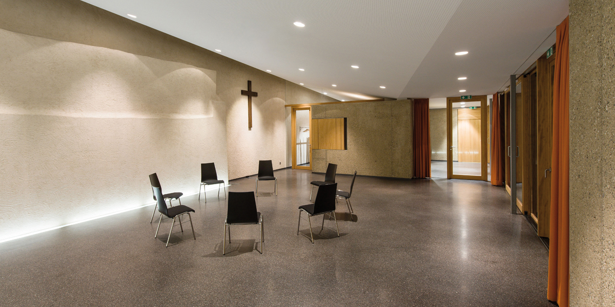 Das kleine Gemeindehaus mit 198 m² BGF fügt sich respektvoll in den eingefriedeten Pfarrgarten mit angrenzendem Pfarrhaus ein und bildet durch das Wechselspiel mit der Umgebung einen identitätsstiftenden Ort für unterschiedlichste Nutzungen.