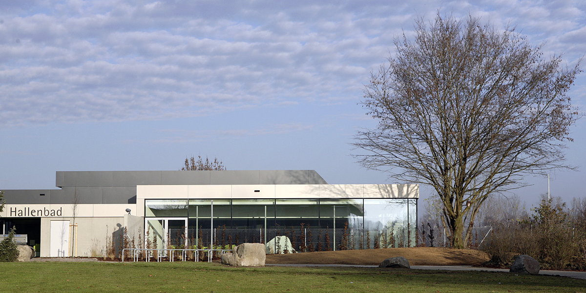 Großen Wert legten die Architekten bei der Sanierung auf eine maximale Tageslichtnutzung – raumhohe Fassadenverglasungen mit großen Schiebeelementen sorgen für eine hohe Transparenz. Um den Liegebereich in der Schwimmhalle großzügiger zu gestalten, wurde die Fassade um zwei Meter nach Süden versetzt. Das außen um die Fassade laufende Holzdeck erzeugt einen fließenden Übergang von Innen- zu Außenraum und sorgt in den Sommermonaten für einen angenehmen Aufenthalt im Freien. Der neu gestaltete Kinderbereich, ein Quelltopf mit Wasserlauf, Wasserigel und Rutsche sowie ein Bistro erweitern das Badeangebot in der Schwimmhalle mit Schwimmer-, Kinder- und Lehrschwimmbecken. Den Umkleidebereich und die Schrankanlagen wurden neu organisiert. Anstelle der Sauna wurde ein Fitnessbereich für die Schwimmabteilung des örtlichen Sportvereins eingerichtet.
