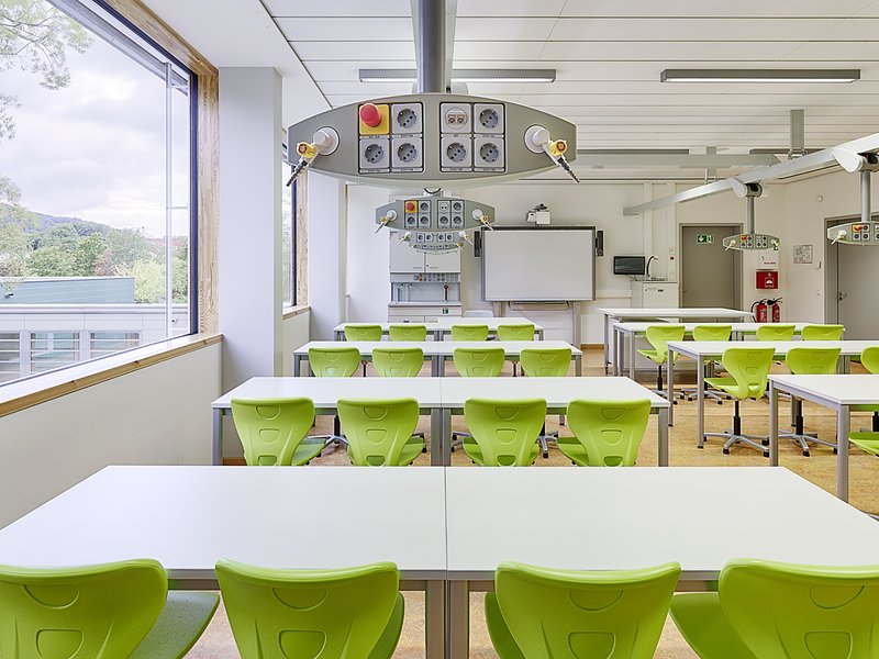 Die Bündelung der Klassen und Unterrichtsräume als ruhigere, konzentrierte Bereiche um die beiden Lichthöfe gruppiert, entspricht aktuellen schulischen Nutzungsanforderungen und schafft Raum für eine zeitgemäße Pädagogik. Die neuen Klassen- und Fachräumen sind hell und freundlich.