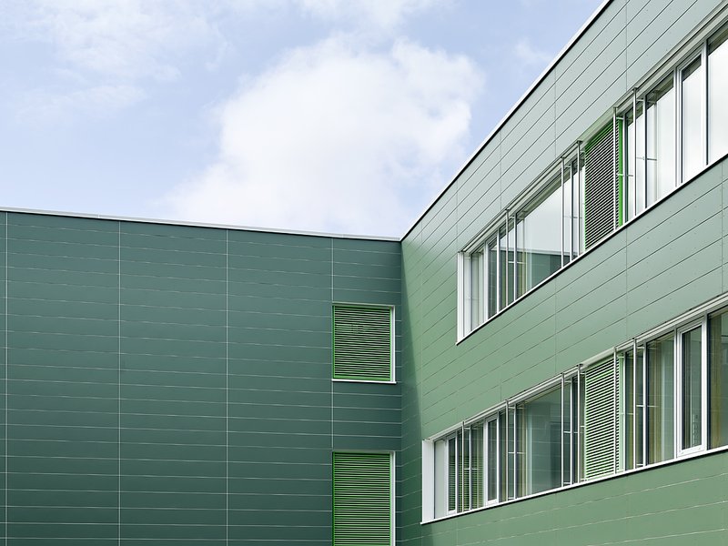 Die ursprünglich gestaffelten Baukörper wurden aufgestockt und in ihrer Tragkonstruktion ergänzt. Die vollständig neu aufgebaute Fassade ist eine hochwärmegedämmte Vorhangfassade in Holzständerkonstruktion mit einer Verkleidung aus grünen Eternittafeln und großzügigen Fensterbändern in Dreifachverglasung mit außenliegendem Sonnenschutz. Die integrierten Lüftungsgitter setzen in unterschiedlichen Grüntönen farbliche Akzente.