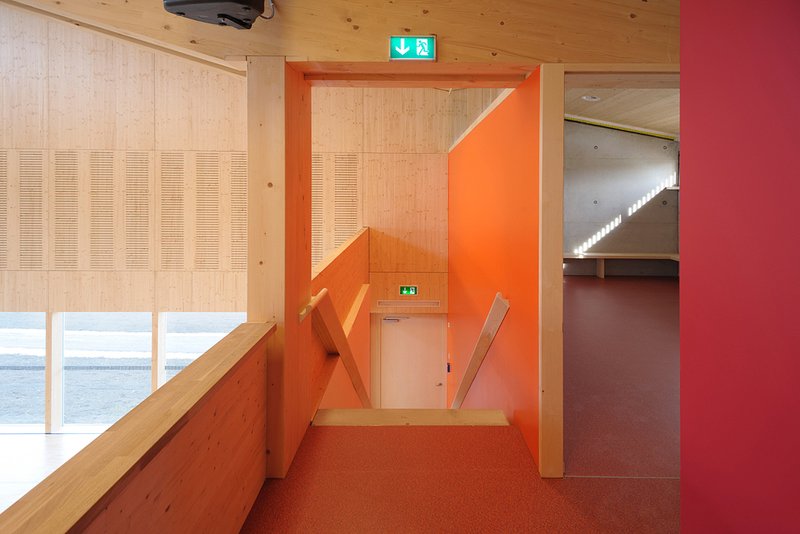 Der Baustoff Holz spielt eine wesentliche Rolle, da er einerseits als nachwachsender und CO2-neutraler Rohstoff die Basis für ein ökologisches und nachhaltiges Konzept darstellt, andererseits ist Holz als Baustoff in der ländlichen Umgebung beheimatet und häufig anzutreffen. Holz wurde für die tragenden Bauteile wie Dachtragwerk und Deckenkonstruktionen, sowie für wesentliche Innenoberflächen und für die Außen- hülle eingesetzt. Es wurden dafür ausschließlich heimische Holzarten wie Douglasie, Fichte und Eiche verwendet. Sämtliche Böden im Obergeschoss sind mit Linoleum belegt.