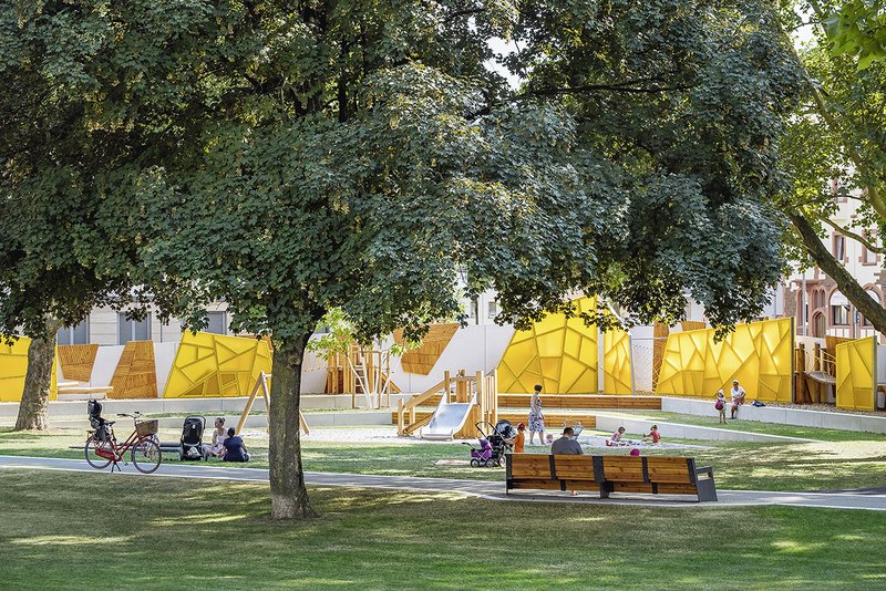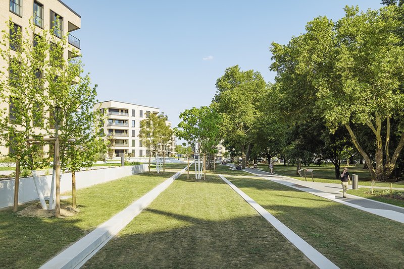 Das von großen Bäumen und Rasenflächen geprägte „Parkdreieck“ des Hanns-Glückstein-Parks dient der Verbesserung des Freizeit, Spiel- und Naherholungsangebots der umliegenden Stadträume. Im Übergang zum Glücksteinquartier ist eine städtebauliche Kante definiert worden, die gleichzeitig den Park im gesamten städtischen Kontext verwebt.