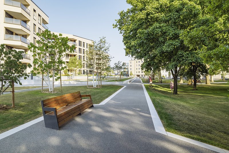 Die Topographie wurde genutzt, um unterschiedliche Ebenen von Privatheit bzw. Öffentlichkeit zu schaffen. Die Stadtvillen liegen mit ihrem unmittelbaren Wohnumfeld auf dem obersten Niveau. Zum Park hin wird das Gelände über Rasenterrassen mit Sitzkanten abgestuft. Durch die Terrassierung entsteht eine subtile, psychologische Differenzierung der Freiraumnutzungen: oben die Stadtvillen mit den gebäudenahen Freiflächen, auf Zwischenebenen der halböffentliche Übergangsbereich und schließlich auf „Bestandsniveau“ der öffentliche Park.