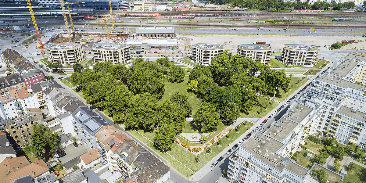 Die Wettbewerbsaufgabe war, die städtebauliche Kante im Übergang zum Glücksteinquartier zu definieren und gleichzeitig den Park im gesamten städtischen Kontext zu verweben. Das Areal hatte durch seine offenen Wiesen und die teils großkronigen Baumgruppen bereits eine gute Freiraumqualität. Dieses Potenzial galt es aufzugreifen und durch freiräumliche Intervention zu einem modernen Stadtpark zu entwickeln. Eine Herausforderung war es dabei, die Wohnnutzung schlüssig in den Park zu integrieren und die Architektur der Stadtvillen selbstverständlich im Einklang der Architektur des Parks zu entwickeln.