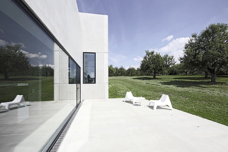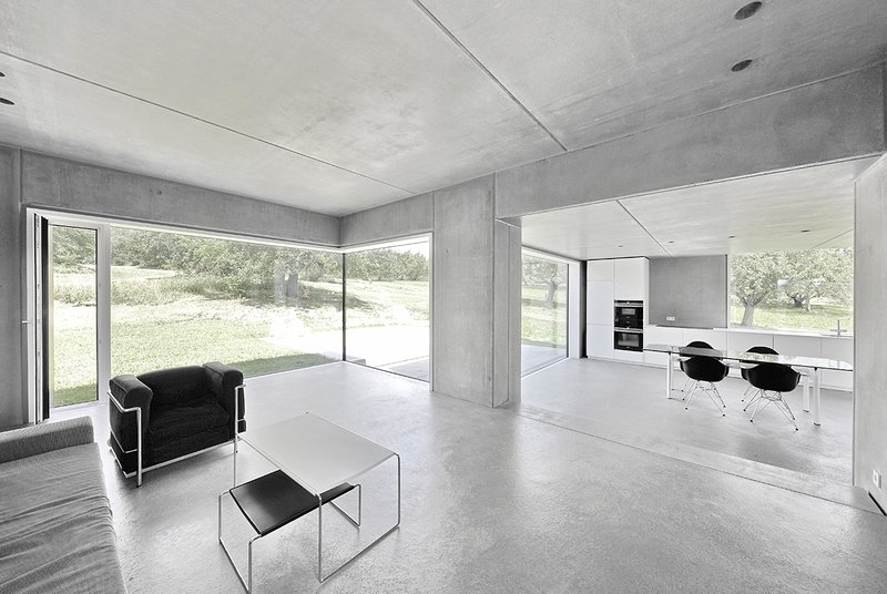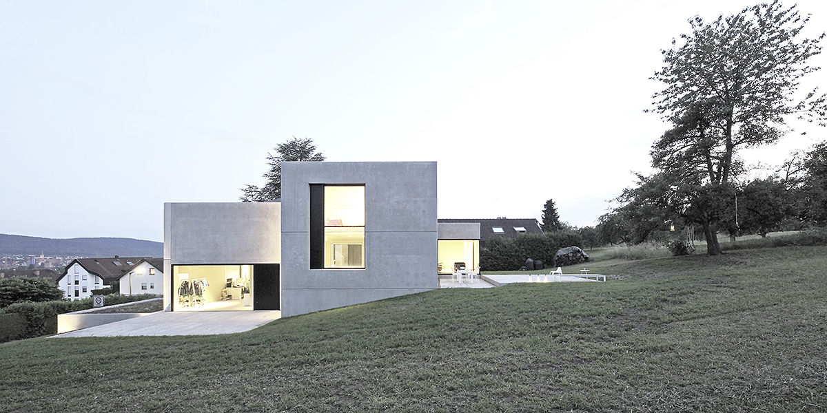Die tiefliegende Wintersonne erwärmt durch die großen Fensteröffnungen die roh belassenen Sichtbetonflächen im Innenraum. Diese speichern die Wärme und geben sie bis in den späten Abend wieder ab.