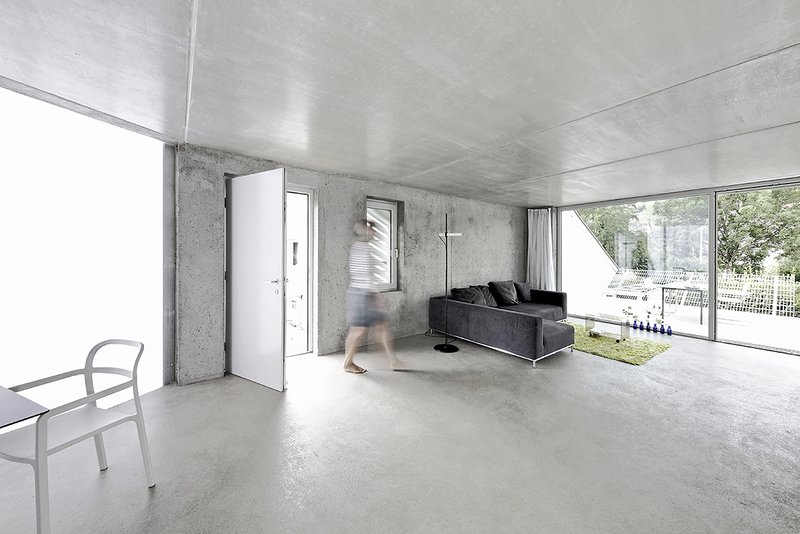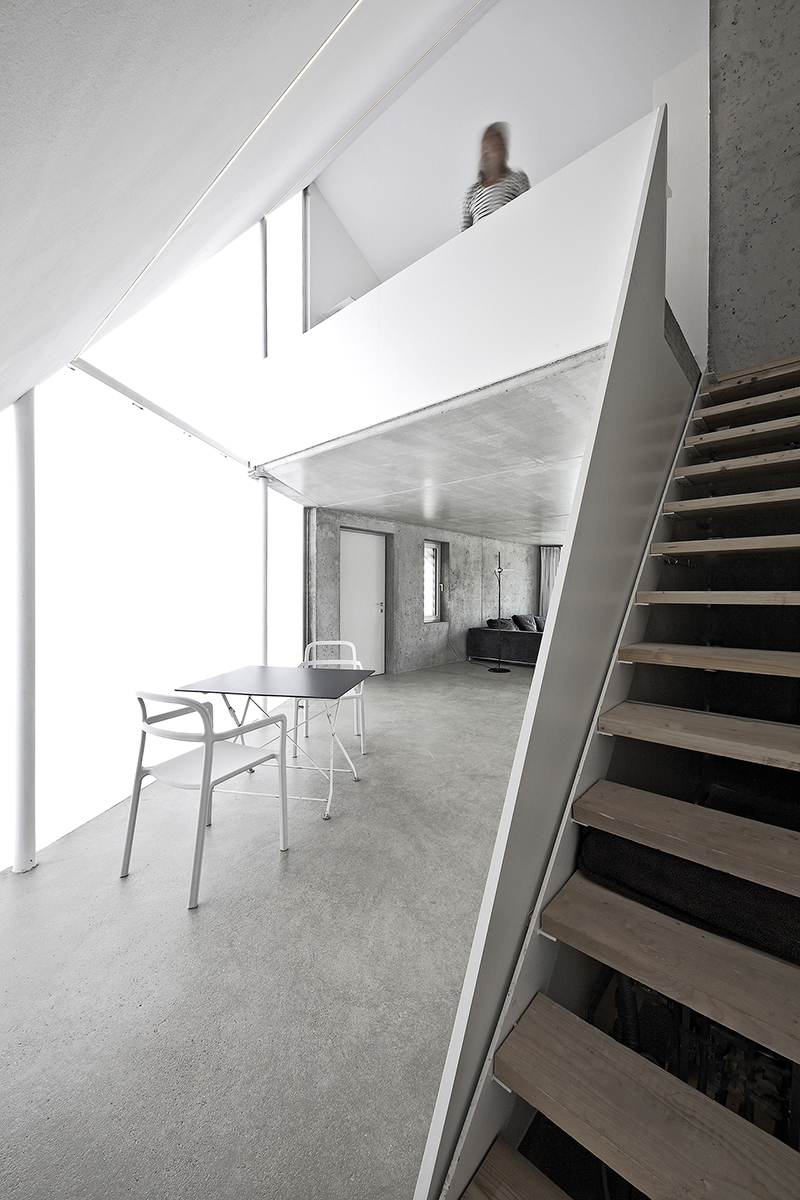 Ein einfacher, schlanker, rechteckiger Baukörper mit einem abgeschrägten Giebelwandbereich, der räumlich den Eingangsplatz definiert und mit seiner vollflächigen, transluzenten Polycarbonatfassade den Innenraum mit viel natürlichem Licht verwöhnt. Der sonst komplett mit Wellzementplatten verkleidete Kubus schwebt zum Tal hin und generiert die überdachte Einstellfläche für das Wohnmobil. Die Konstruktion, eine Mischbauweise aus Stahlbeton im Untergeschoss/Erdgeschoss und Holzrahmenbau im Dachgeschoss mit Dach. Nur mit der Reduzierung von Arbeitsschritten und Eigenleistung konnte der enge Kostenrahmen eingehalten werden. Unbehandelter Beton, eingelegte Heizungsrohre zur Bauteilaktivierung in der Stahlbetondecke, diese geglättet und farblos imprägniert zum fertigen Fußboden. Ein "veredelter Rohbau", der Strukturen schafft und sich auf das wesentliche konzentriert.