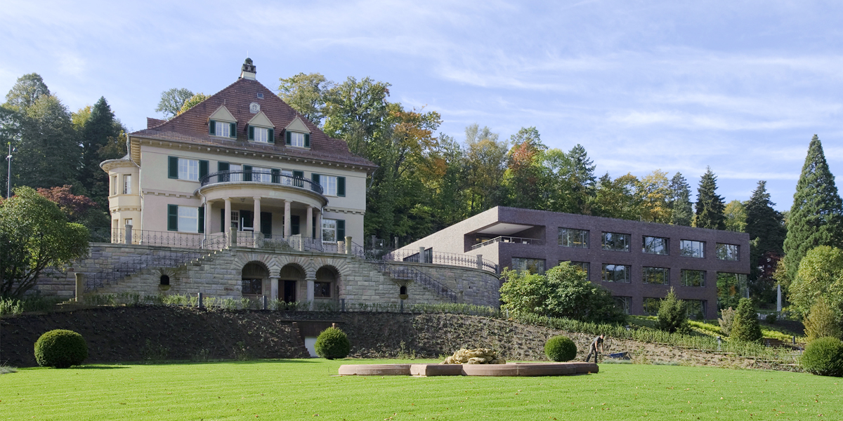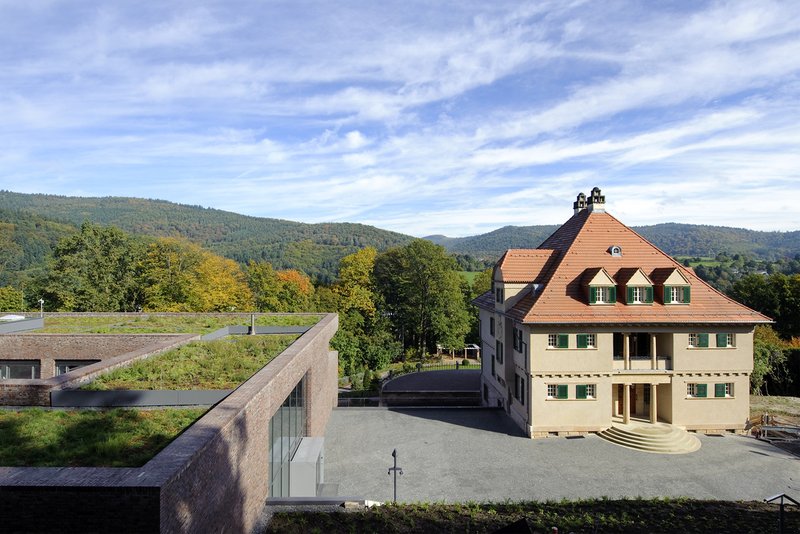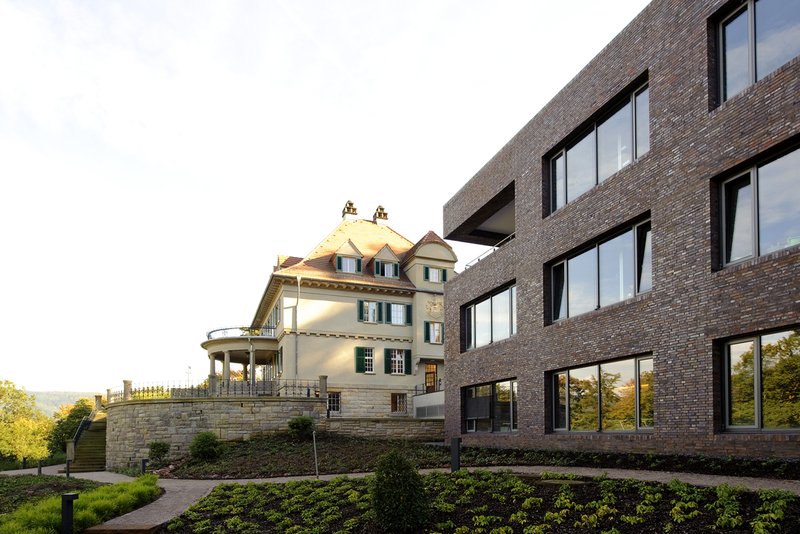 Durch den Rückbau der vorhandenen, in ihrer Form-, Material- und Farbwahl sehr inhomogen wirkenden Gebäudeteile des 1994 angebauten Schulungszentrums und die Komprimierung des Umbaus auf einen klaren Kubus entstand ein neuer, spannender Kontext zwischen Villa und neuem Gebäude. Die sanierte Villa hat wieder Raum zum Atmen und wirkt, trotz Ihrer geringeren Baumasse dominant. Der mit Torfbrandklinkern verkleidete und mit einem begrünten Dachgarten aufgewertete Neubau nimmt sich dagegen zurück und fügt sich nun harmonisch in die Parklandschaft ein.