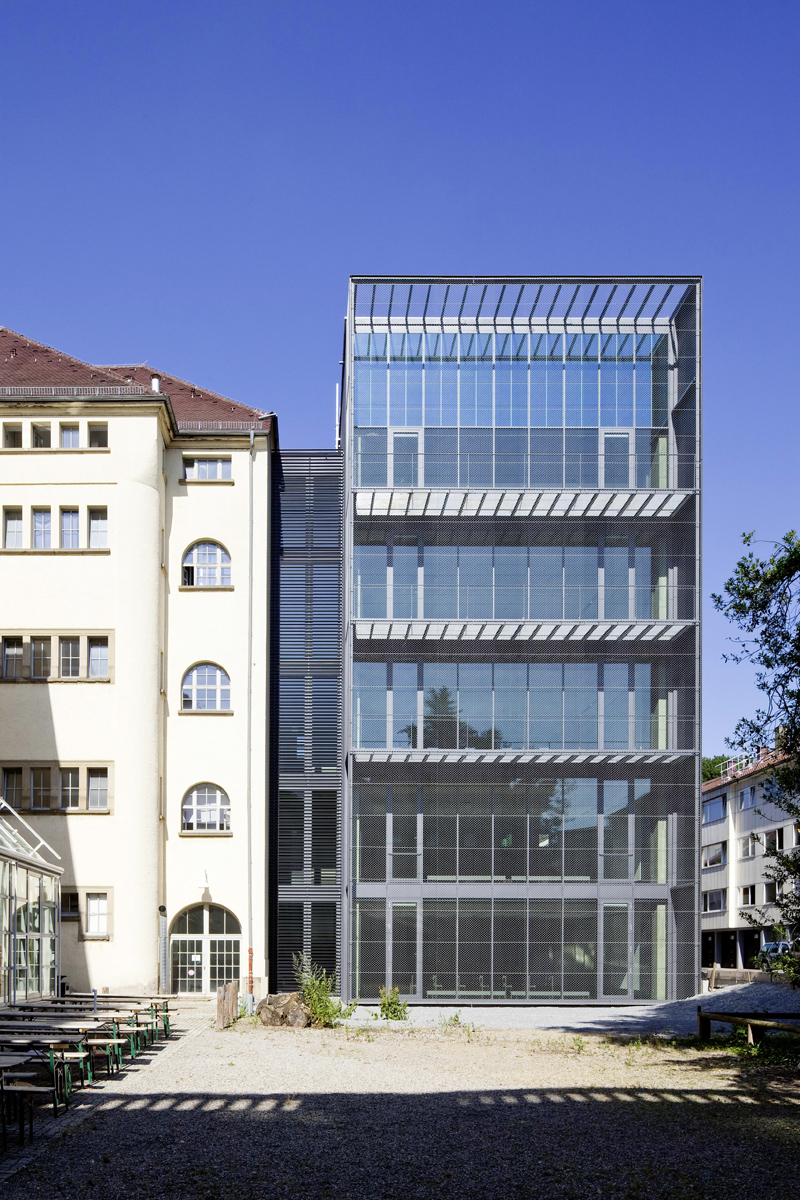 Der aufragende sechsgeschossige Erweiterungsbaukörper wird durch ein zurückgesetztes Treppenhaus mit dem Bestand verknüpft. Jedes Stockwerk erhält somit am Ende des Flures einen großen, flexibel nutzbaren Raum. Dieser Raum ist auf drei Seiten massiv umschlossen und hat eine komplett offene Seite zum Hof. Innenräumlich wird der Blick zur grünen Mitte des Gebäudekomplexes gelenkt und nach außen erfolgt eine gewisse Abschirmung zum Straßenraum. Geometrisch bezieht sich die Hüllflächenstruktur des Neubaus auf das Gesamtensemble und stärkt die Beziehung zum Innenhof.