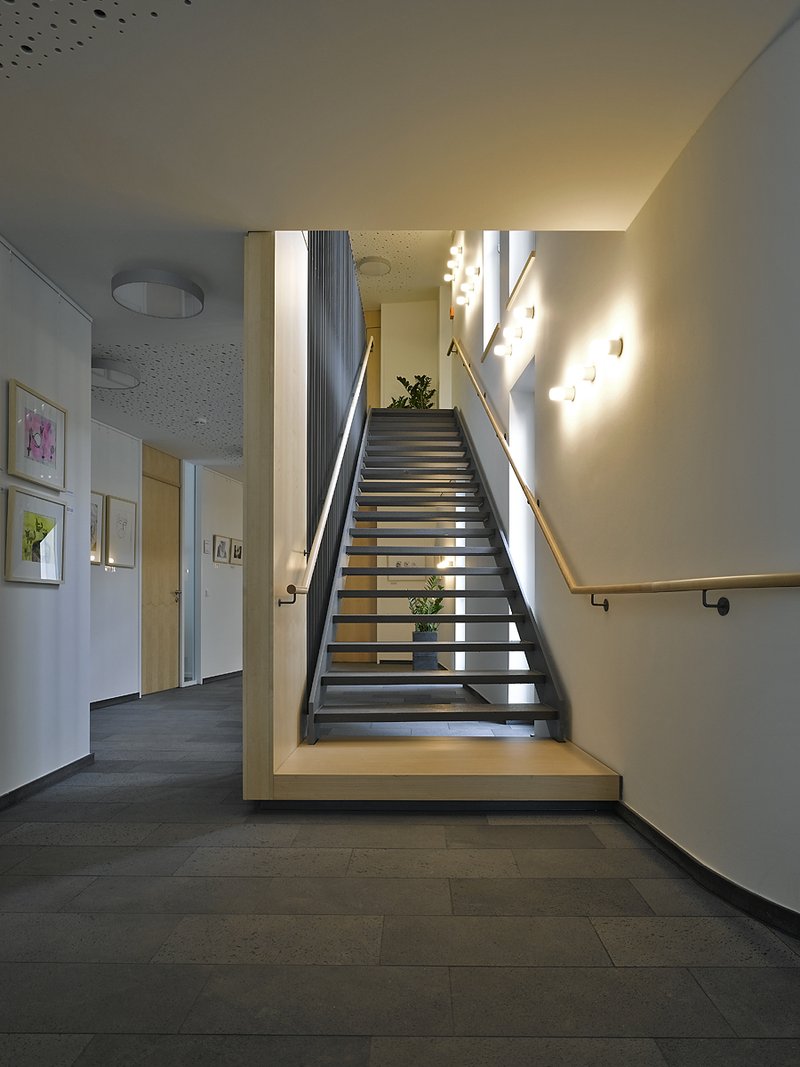 Nach außen zeigt der kantige Baukörper eine rauhe, ziegelfarbige schützende Haut und stellt damit Bezüge zum Ort her, während im Hofbereich helle, glatte Wände in weichen Formen einen Filter zwischen Innen und Außen formen. Der Hof verbindet nicht nur die eng miteinander korrespondierenden Nutzungen des Hauses, sondern lädt auch die Öffentlichkeit zur Durchwegung und zum Verweilen ein. Er bildet somit funktional eine Art ‘Foyer’ unter freiem Himmel, in dem Begegnung und Austausch stattfinden können. Der tragende Gedanke einer christlichen Gemeinschaft wird durch die räumliche Struktur der Verflechtung der internen und externen Erschließungsflächen gelebt.