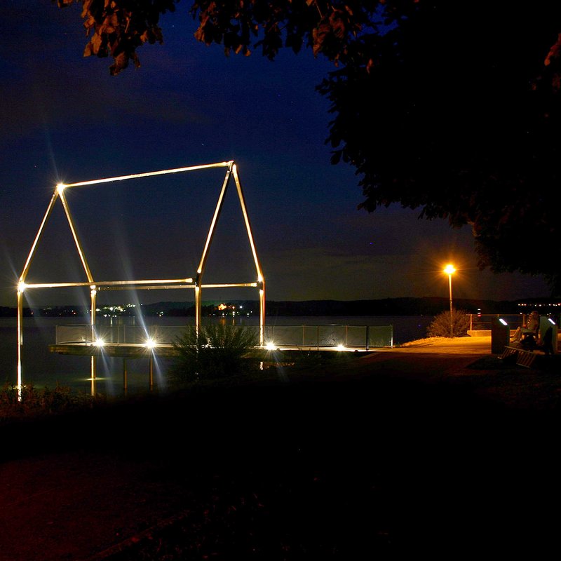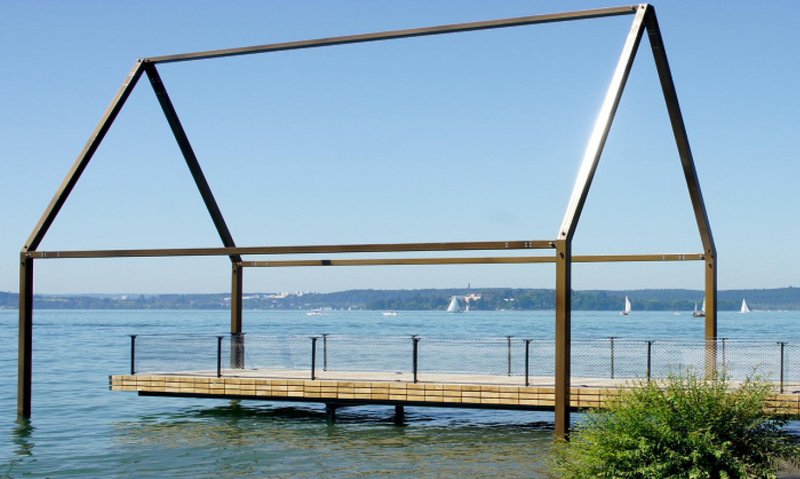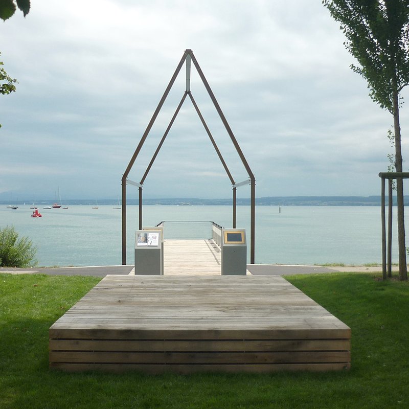 Die bronzefarbene Stahlskulptur zeichnet die Umrisse eines "ursprünglichen Pfahlbau-Hauses" nach. Hindurch verläuft ein Aussichtsdeck, das vom Besucher begangen werden kann und an dessen Ende man im Bereich des prähistorischen Pfahlbauumfeldes steht. Der Besucher wird hier bei klarem Wasser vielleicht den ein oder anderen "Stumpf" der Pfahlbausiedlungen erahnen können.