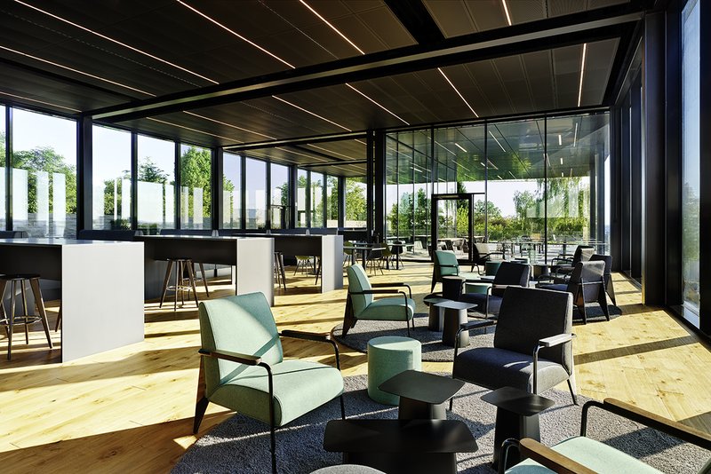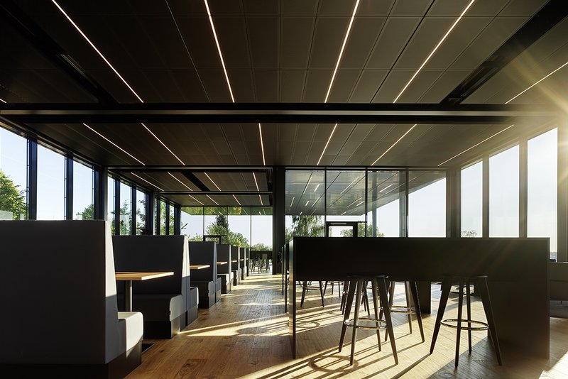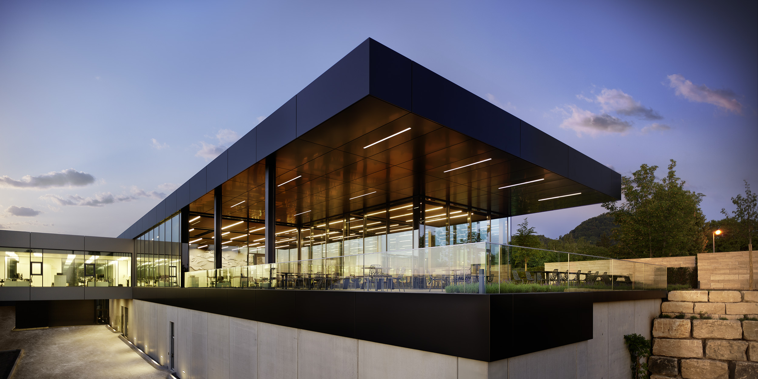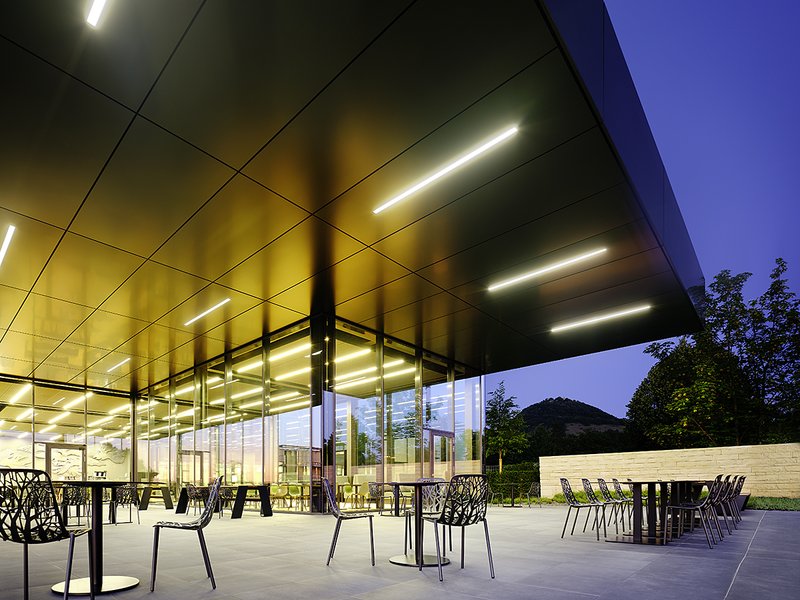 Das Betriebsrestaurant erwächst in Fortführung der Attikalinie des Technikums. Dadurch entsteht ein lang gestreckter Riegel, dessen verschiedene Nutzungen an der Fassade ablesbar sind. So ist die Fassade des Technikums eher geschlossen und introvertiert, während der Gastraum des Restaurants als hochtransparenter, pavillonartiger Kopfbau den lang gestreckten, riegelförmigen Baukörper auflöst und gläsern enden lässt. Lediglich im weit auskragenden Dachvorsprung werden die großflächigen Aluminiumverbundtafeln formal weitergeführt. Die Auskragung dient als Überdachung der weitläufigen Freiterrasse und als wettergeschützte Außenfläche für flexible Nutzungen wie Events, Arbeiten und Erholung. Der Innenraum des Betriebsrestaurants ist als luftiger, sonnenlichtdurchfluteter freitragender Pavillon konzipiert. Auf Wände wurde komplett verzichtet, um maximale Transparenz und Ausblicke zu ermöglichen. Der Innenraum verläuft durch die komplette, bodentiefe Verglasung fließend mit dem Außenraum. Die überdachte Terrasse ist ganzjährig nutzbar und bietet durch die rahmenlose umlaufende Glasbrüstung großzügige Aussichten in den umgebenden Baumbestand und den neuen Viewing Garden im Süden. Durch die Verwendung von Natursteinmauerscheiben, immergrünen Pflanzen und einer ruhigen Rasenfläche wurde ein Viewing Garden geschaffen, der eine direkte und unverbaute Sichtbeziehung zur Achalm ermöglicht. Angrenzende, lärmende Straßen sowie ein Entsorgungshof werden durch dieses landschaftsarchitektonische Konzept ausgeblendet.