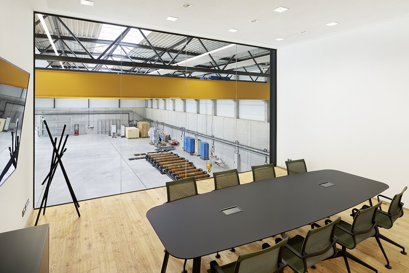 Das Technikum und das Betriebsrestaurant wurden als ein zusammengehöriger Baukörper konzipiert, der bis zur Hälfte in das Gelände eingegraben ist. Dadurch tritt die Halle des Technikums, die produktionsbedingt 12 Meter hoch ausgeführt werden muss, am Rande der Liegenschaft mit einer relativ niedrigen Attikahöhe von 6,30 Metern in Erscheinung. Das Technikum selbst ist als Stahlkonstruktion ausgeführt. Die Halle ist zweifach bekrant und multifunktional nutzbar, das heißt es wurde eine stützenfreie Konstruktion gewählt, deren weitspannende Stahlfachwerkträger dies konstruktiv und wirtschaftlich optimal ermöglicht.