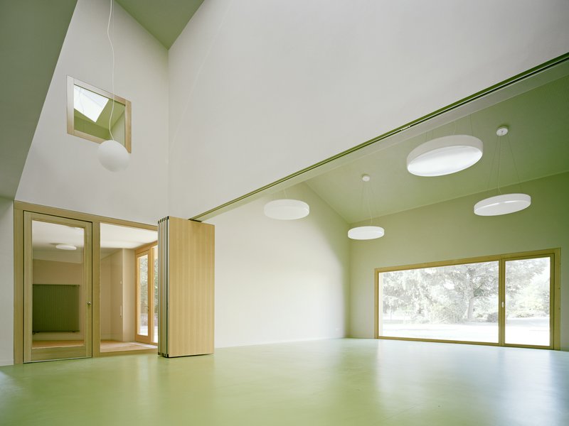 Das Kinderhaus bietet Raum für zwei Kindergartengruppen und eine Krippengruppe. Ein trichterförmiger Eingang nimmt die Kinder von der Platzseite auf, versammelt sie in einem großzügigen, hellen Raum und entlässt sie über die Gruppenräume ins Grüne. Der zentrale Erschließungsbereich als Herzstück des Gebäudes ist kommunikative Mitte für Groß und Klein. Ein zentraler Luftraum ermöglicht den Blick bis unter den Dachfirst und hebt die Trennung zwischen den Geschossen auf. Die Gruppenräume sind konsequent nach Süden ausgerichtet. Der Mehrzweckraum fungiert als Mittler zwischen Foyer und Platz. Er kann großzügig zu beiden Seiten geöffnet werden und schafft Raum für Feste, Veranstaltungen und Vorführungen.
