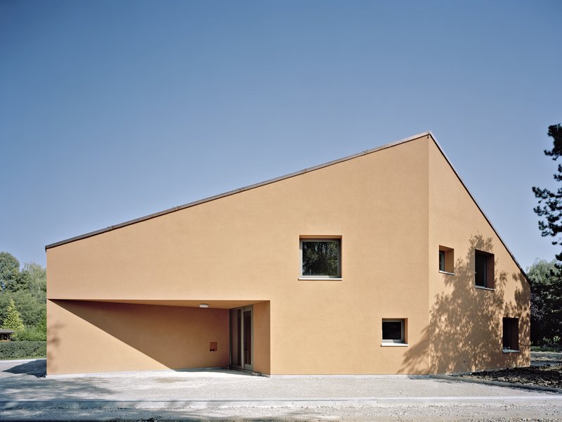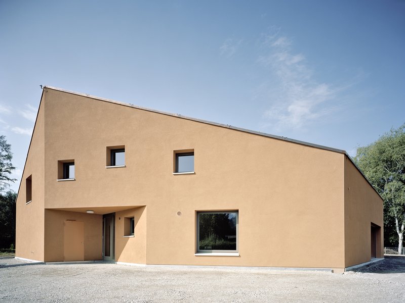 Der Satteldachtypus der Nachbarbebauung wird neu interpretiert. In Kombination mit dem polygonalen Grundriss entsteht eine markante Kubatur von hohem Wiedererkennungswert. Trichterförmige Einschnitte in der Kubatur bilden überdachte Eingänge. Das Gebäude wird gestalterisch als erdverbundener Monolith interpretiert, Fassade und Dach gehen in Farbe und Struktur ineinander über. Die Fassaden wurden in natürlich eingefärbtem Edelkratzputz ausgeführt, die Dachhaut als Flüssigabdichtung mit Natursteineinstreuung. Die Herausforderung lag in der Abstimmung der beiden Materialien in Farbe und Struktur.