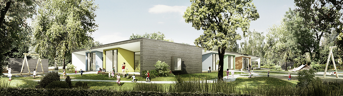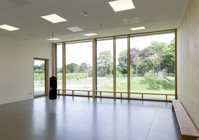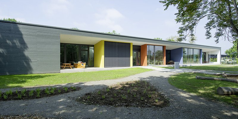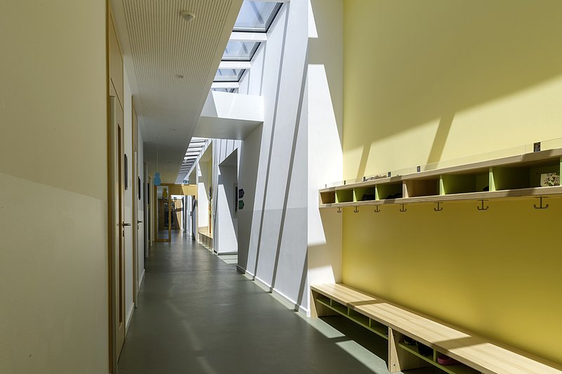 Holzkonstruktion, natürliche Materialien, moderne aber zurückhaltende Farbigkeit sowie energieeffiziente Gebäudetechnik bilden die funktionale Hülle, der mit Tageslicht durchflutenden Räume, für Regel- und Ganztagsbetreuung von U3 und Ü3-Kindern. Jede Raumeinheit bildet für sich sowohl einen Rauchabschnitt und einen technisch separaten Bereich, mit Sanitäreinrichtungen, Lüftungsanlage und Ausgang ins Freie. Eine Teilbarkeit in verschiedene Betreuungs- und Altersgruppen ist damit gegeben.