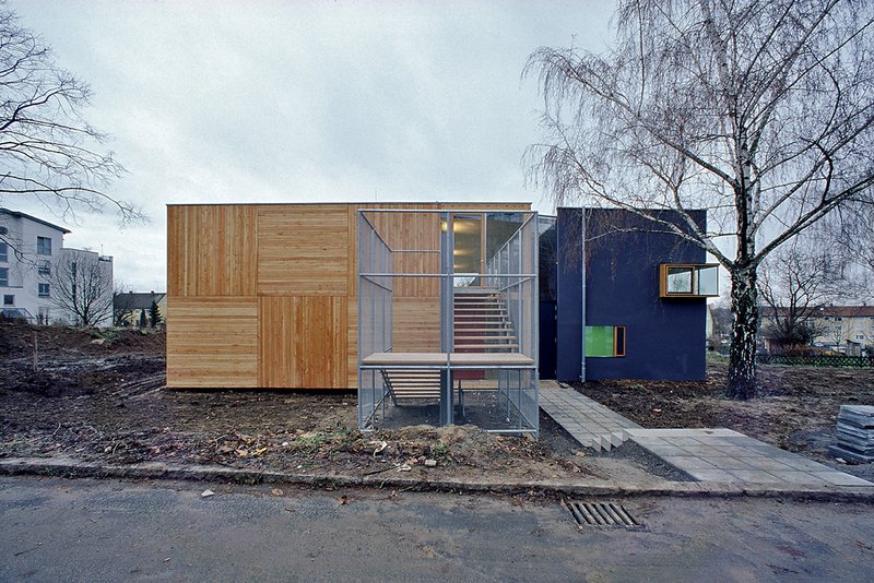 um möglichst homogene räume zu schaffen, wurde für den bodenbelag ebenfalls holz gewählt. die außenschalung, aus unbehandelten lärchebrettern, wurde im horizontalen/vertikalen wechsel ausgeführt, was den nahezu würfelförmigen aufbau von außen noch betont. die nebenraumspange wurde als konventioneller massivbau errichtet und trägt als wärmespeicher zum ausgeglichenen raumklima bei.