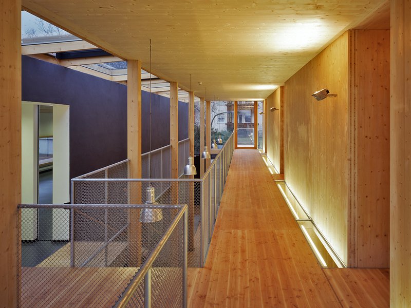 das raumprogramm der stadt sah einen konventionellen aufbau des kindergartens vor, was identische gruppen- und intensivräume bedeutet. diesem prinzip folgend wurde der holzbau in einem dreidimensionalen raster mit vorgefertigten dickschichtholz wand- und deckenelementen aus unbehandeltem fichteleimholz, innen teilweise in sichtqualität, ausgeführt.