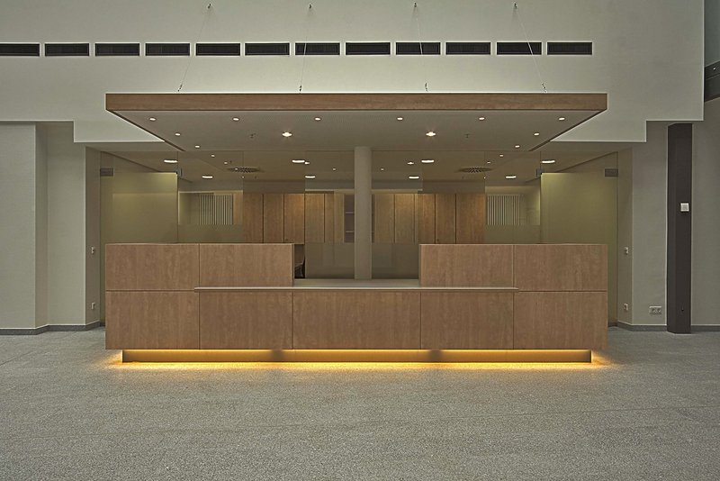 Im Rahmen einer zeitgemäßen Krankenhausstruktur ist es absolut notwendig, dass eine zentrale Patientenaufnahme zur Verfügung steht. Durch einfache Ergänzungen und Umwidmungen im Erdgeschossbereich konnte eine zentrale Aufnahme geschaffen werden. Ein Teil der physiotherapeutischen Abteilung und ein Teil der ehemaligen chirurgischen Ambulanz wurde für die Zusammenfassung dieser Funktionsstelle benötigt.