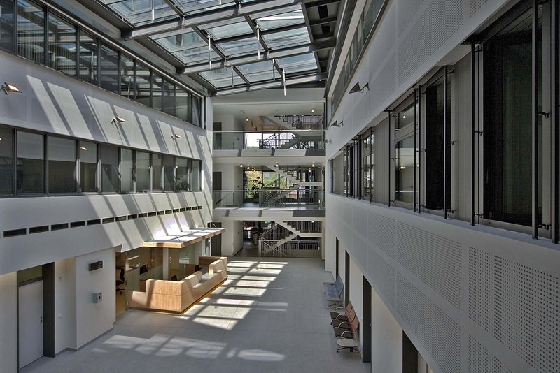 Der Wartezone gegenüber sind die Untersuchungsboxen angeordnet, die direkt zu erreichen sind. Zum Treppenhaus hin wurde die Wandfläche im Erdgeschoss geöffnet. Der Treppenraum im ersten und zweiten Obergeschoss ist galerieartig ausgebildet. Die Dachverglasung ist in einer Stahl-Alu-Konstruktion ausgeführt. Die Dachfläche wurde voll verglast, integriert sind die vorgeschriebenen Rauch-Abzugs-Elemente.