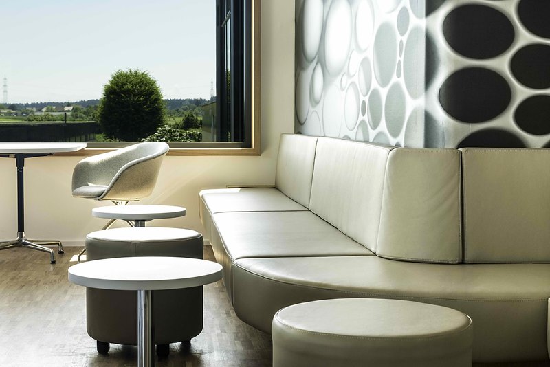 Besucher gelangen über den großzügigen Eingangsbereich intuitiv zum Empfang, von dort aus werden sie über den Wartebereich in die verschiedenen Teilbereiche geleitet. Der leicht erhöhte Wartebereich mit weichen Bodenmaterial und wohnlichen Sitzgelegenheiten wirkt einladend und versinnbildlicht das Willkommen bei Blum Novotest. Von diesem Punkt aus sind sowohl alle Firmenbereiche in den angrenzenden Gebäuden, als auch die Produkte von Blum Novotest im "Schaufenster" des von hier einsehbaren Tech-Centers zu überblicken. Vom Wartebereich aus erreicht man auch die Büros und den Schulungs- und Konferenzbereich, welcher sich mittels einer Glasschiebetür mit dem Tech-Center verbinden lässt. Angenehm unauffällig positioniert sind die hochwertigen Sanitärbereiche für das Schulungs-und das Tech-Center.