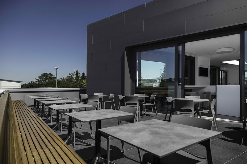 Das zentral gelegene Treppenhaus erschließt das Obergeschoss mit der Kantine für rund 150 Personen, die mit Cook & Chill-Konzept und einer eigenen Küche betrieben wird. Die Kantine ist in verschiedene Zonen wie Lounge, Bistro, Terrassenplätze und konventionelle Sitzgruppen gegliedert, um den Besuchern und Angestellten neben den Essenszeiten auch als zwanglose Besprechungs- und Ideenaustauschbereiche mit Ausblick auf Landschaft und Alpen dienen zu können.