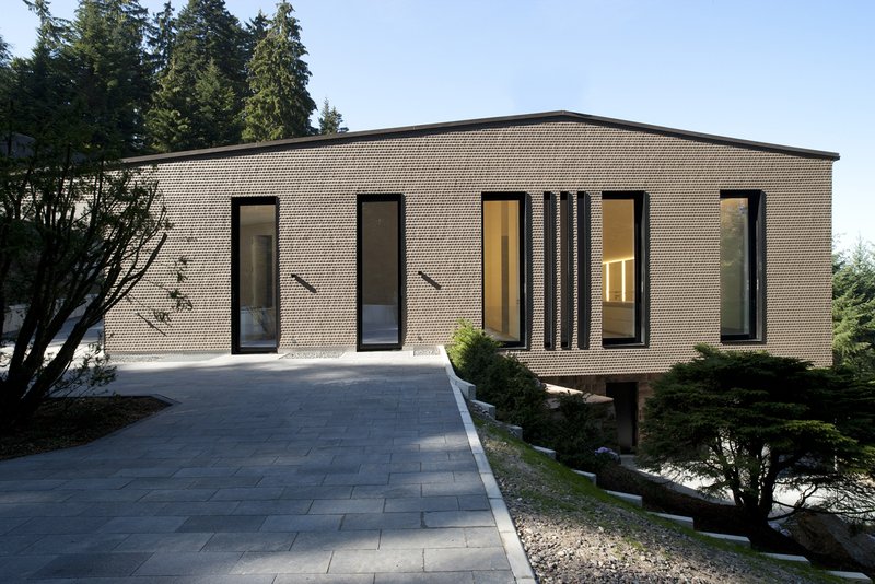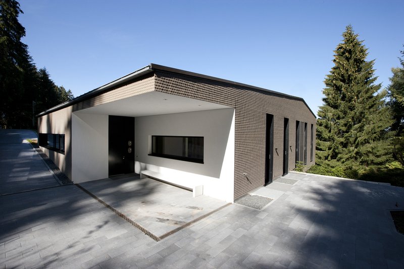 Die Bauherren wählten den Ort bewusst als Rückzugsort aus ihrem städtischen Wohnumfeld und gaben für ihre „Kunstscheune mit Ausblick“ nur ein einfaches Raumprogramm, bestehend aus Wohn- und Schlafbereich, vor. Der bestehende Keller wird für einen Gästebereich und die dienenden Räume des Hauses genutzt. Wichtig war den neunen Eigentümern eine großzügige Raumaufteilung, verbunden mit einer adäquaten Raumhöhe, um einen entsprechenden Rahmen für die vorhandene Kunstsammlung zu schaffen. Ziel des Entwurfes war, das neue Gebäude in einer zeitgemäßen Form in die Landschaft einzugliedern. Aus dieser Bestrebung entstand schon früh im Planungsprozess die Idee, das Gebäude mit einer Holzschindelfassade zu versehen, wie man sie an den alten Herbergen der nahe gelegenen Schwarzwaldhochstraße vorfindet. Der Gebäudekörper selbst nimmt sich dabei bewusst zurück und ist als simpler Kubus mit leicht geneigtem, asymmetrischem Satteldach geplant, der seine Gliederung durch ein strenges Fensterraster erfährt. Die Farbwahl der Schindeln nimmt die Farbstimmung des Waldes auf und unterstreicht die Bestrebung nach Eingliederung in die Natur. Die schmalen, 3,60 m hohen Fensterausschnitte durchbrechen die Fassade nur wenig und lassen die Wandfläche und damit die Schindelfassade geschlossen wirken. Im Innenraum dienen die bis zu 5 m hohen Wandflächen zwischen den Fenstern als Flächen für Bilder. Die Fassade kann bei Bedarf mittels Schiebeelementen ganz geschlossen werden. Diese überdimensionalen Fensterläden sind ebenfalls mit Schindeln verkleidet und verschwinden bei Nichtgebrauch in Parktaschen hinter der Fassade. Das Gebäude wirkt im verschlossenen Zustand noch unaufgeregter und ruhiger. Einzig im Eingangsbereich und auf der Hangseite wird die Schindelfassade durch einen Einschnitt bzw. durch eine großzügige Verglasung durchbrochen. Der Einschnitt markiert den Zugang zum Gebäude, die Verglasung eröffnet den Fernblick in die Rheinebene und auf die Vogesen.