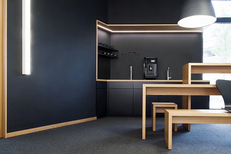 Von der lichten Präsenz des Optikerbereichs hebt sich der Akustikbereich visuell stark ab: Wand, Boden und Decke sind tiefschwarz. Kräftige, zeichenartige Lichtkanäle führen Kunden zu den akustisch ausbalancierten Beratungsräumen. Eine Kaffeebar dient als Kommunikations- und Warteinsel. Eigens angefertigtes Mobiliar aus Naturmaterial-Klassikern, wie Eichenholz oder Möbellinoleum, schaffen hier eine hohe Aufenthaltsqualität.