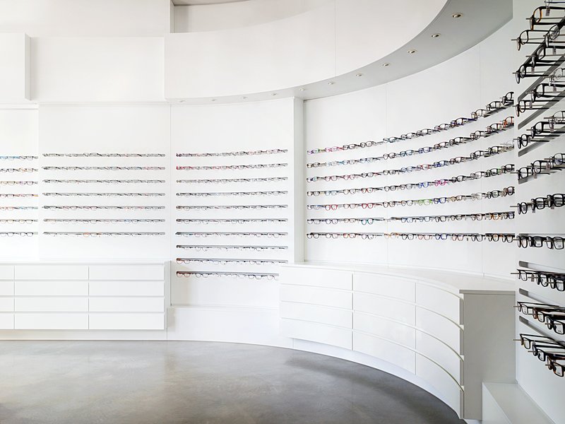 Die Welle im Optikbereich folgt einem strengen System aus Vor- und Rücksprüngen: So entstehen Nischen für eine übersichtliche und flexibel bestückbare Brillenpräsentation. Wir entwickeln eine Brillenhalterung, die einzig die Brille, nicht die Halterung, in den Vordergrund stellt und auch in den gerundeten Bereichen perfekt funktioniert.
