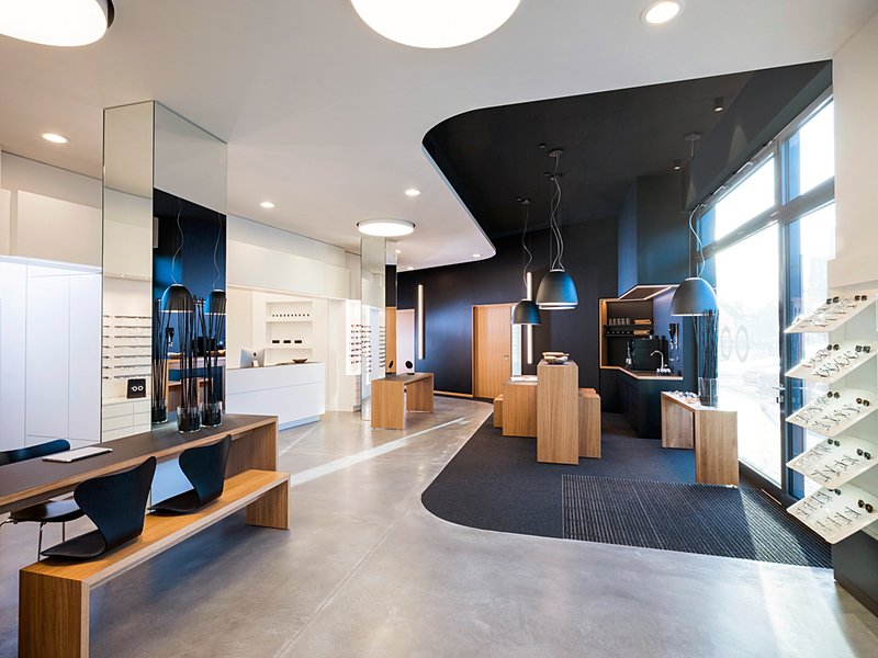 Filigrane LED-Lichtkanäle und Spots in den Rundungen setzen Lichtakzente und verstärken das Relief der Wellenwand. Große Downlights in der abgehängten Decke des Optikbereichs inszenieren die wichtigsten Ladendetails und markieren den Ort der zentralen Brillenberatung. Die dunklen Oberflächen des Akustikbereichs erhellt eine angenehme, natürlich wirkende LED-Beleuchtung. Hochflorige schallabsorbierende Teppichböden optimieren die gesamte Raumakustik.