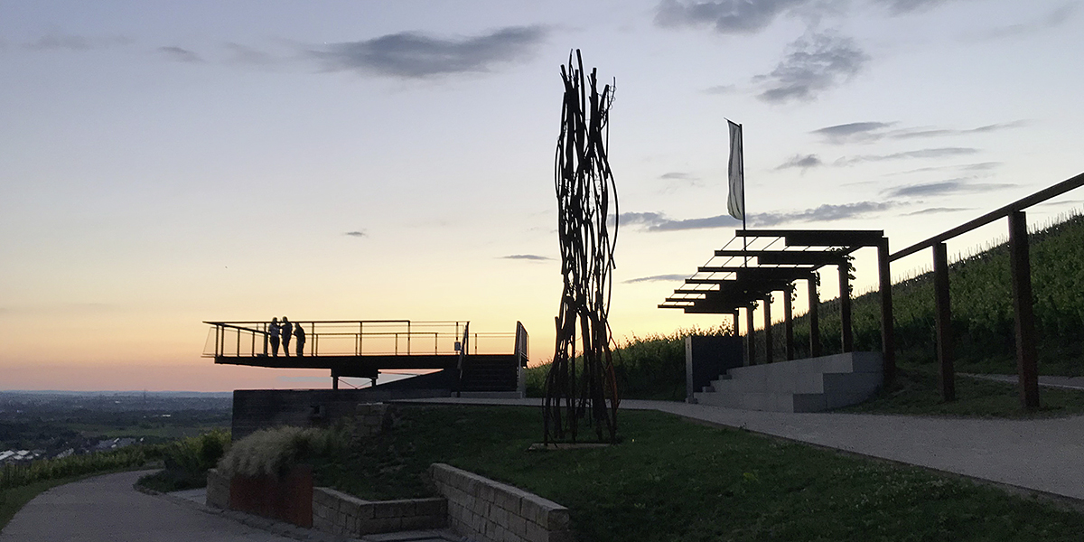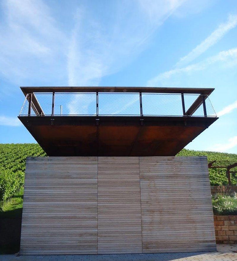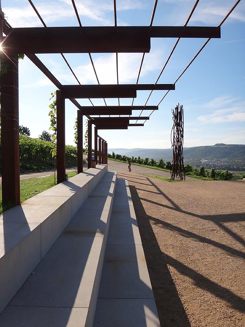 Im Zuge der Rebflurbereinigung in den 1970er Jahren wurde auf einer Restfläche unterirdisch ein begehbarer Frischwasser-Hochbehälter errichtet, das sogenannte „Wasserhäusle“. Die Dachflächen dieses Funktionsbauwerks wurden nun als einer der „Höhepunkte“ im Rahmen des Projekts Landschaftspark Rems mit Aussichtsplattform und einem öffentlichen Platz überbaut. Massive Sitzstufen bilden zusammen mit einem Rankgerüst aus Cortenstahl den Rücken zum Hang hin, während die auskragende Plattform über dem Tal schwebt. Cortenstahl, Eichenholz, Sandstein, sandgestrahlter Beton und wassergebundene Beläge gehen mit den umgebenden Weinbergen je nach Jahreszeit ein Wechselspiel von Oberflächen und Farben ein. Zu sehen ist auch eine Skulptur von Manuela Tirler. Der Platz in den Weinbergen: Ein Aktionsraum inmitten der Reben für Konzerte, Lesungen, Theaterspiel, Degustationen oder einfach für eine Einladung zum Verweilen und Genießen!