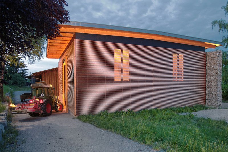 Ein einfacher Kubus als Gebäudeform, einfache und klare Details sowie ablesbare Abgrenzungen zwischen den einzelnen Bauteilen wie Dach, Holzwände und Gabionenwand ergeben ein hohes Maß an Wirtschaftlichkeit und lassen ein spannungsreiches und harmonisches Gesamtgebäude entstehen. Das Dach wird noch begrünt, statisch sind Photovoltaikelemente berücksichtigt.
