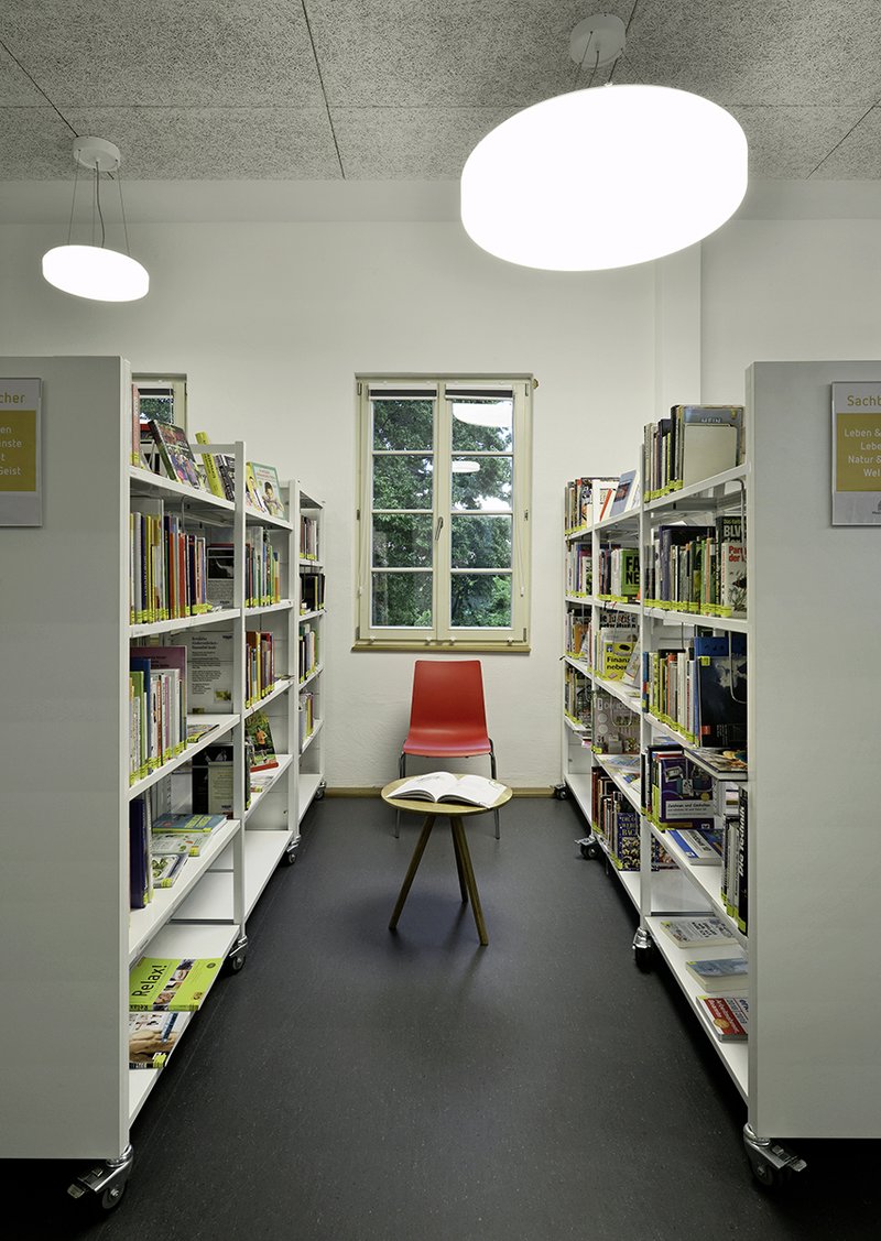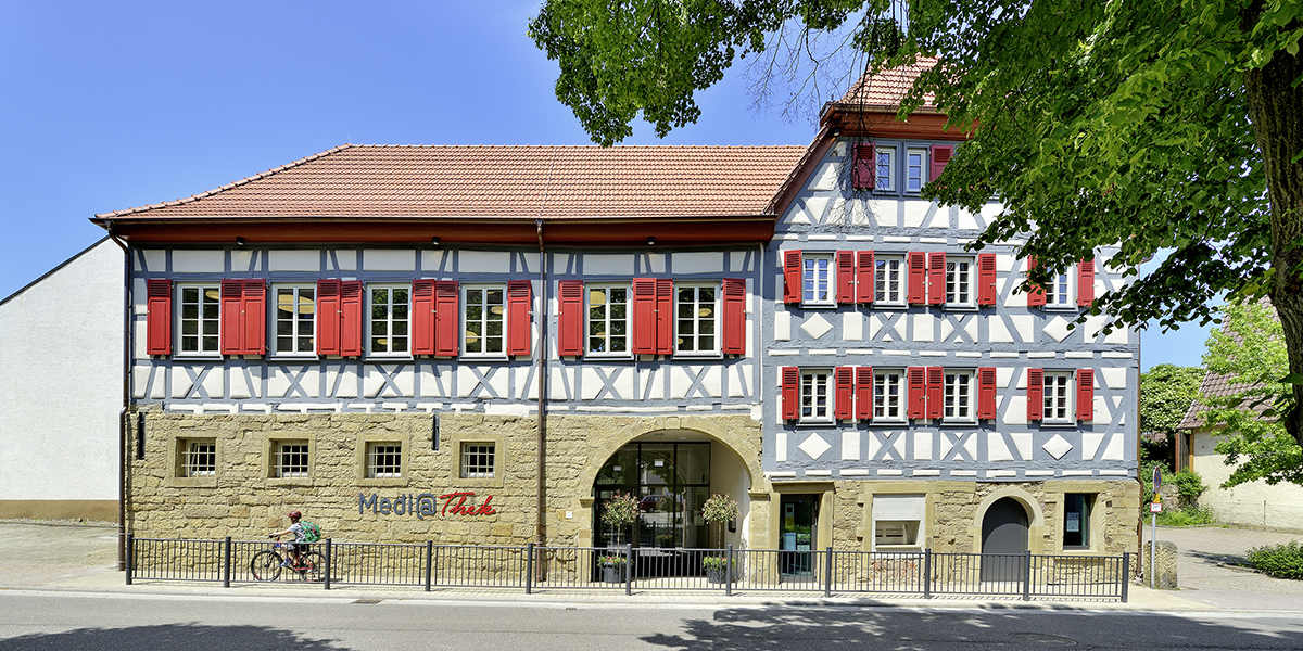 Die neue Mediathek entstand im Gebäude des ehemaligen Gasthauses „Rössle“. Das Gebäude selbst wurde 1755 auf einem historischen Gewölbekeller wiedererrichtet und um 1823 um einen Anbau erweitert. Nach jahrelangem Leerstand wurde das denkmalgeschützte Gebäude in würdevollem Umgang aufwendig saniert und teilweise erweitert. Ein sichtbar neuer – in Gestaltung und Materialität – vertikaler Eschließungskern wirkt als Verbindungsglied und Gelenk der beiden Baukörper und als deutliche Differenzierung und Erkennbarkeit zwischen Alt und Neu. Er beinhaltet neben der Haupttreppe auch einen Aufzug zur barrierefreien Erschließung.