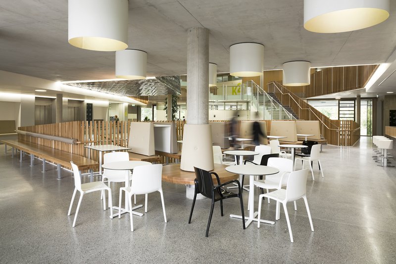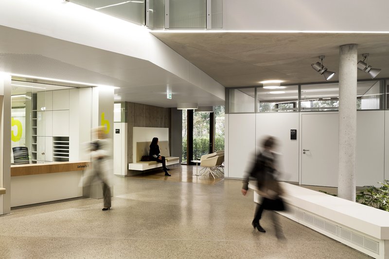 Eine Reihe von besonderen Orten lagert sich an das Atrium an: An zentraler Stelle im Erdgeschoss ist der Empfang angeordnet. Die Cafeteria befindet sich vom Eingangsbereich aus gut sichtbar in Ebene 01 direkt am Atrium und hält Getränke und einfache Gerichte bereit. Der in sich geschlossene, introvertiert gestaltete "Raum der Stille" als ein besonderer Ort der Ruhe und Besinnung liegt gut sicht- und erreichbar in Ebene 02.