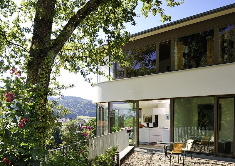 Ziel war es trotz steiler Hanglage ein Wohnen und Arbeiten auf drei Ebenen gut zu verbinden. Ein Maximum an Aussicht, ohne eingesehen zu werden, wurde durch Abwinkeln der Nord-Ostfassaden erreicht.