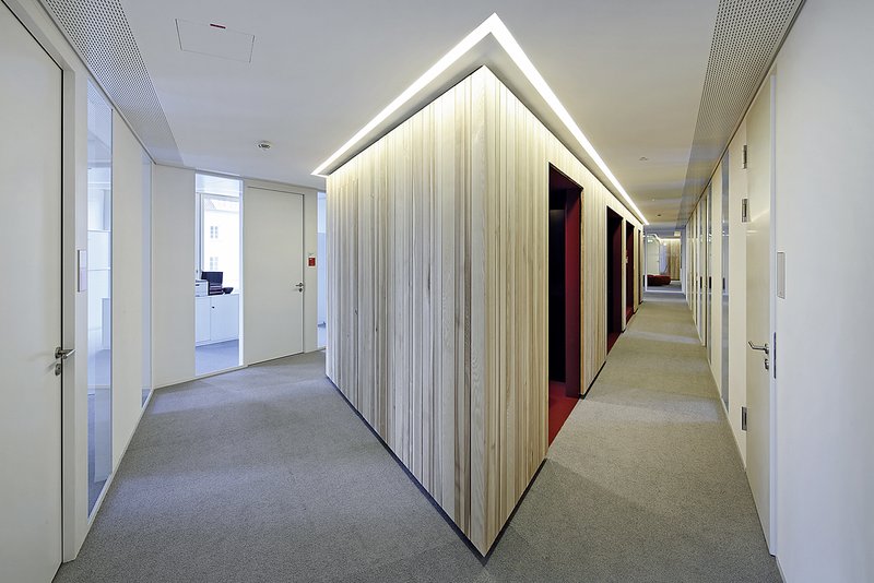 Prämisse der Struktur war dabei höchste Nutzungsflexibilität, attraktive natürlich belichtete Räume, die sowohl Öffentlichkeit wie auch Diskretion nach allen Seiten zulassen. Die ganzheitliche solide Erscheinung des Gebäudes wird durch die Verwendung von natürlichen Materialien der naturbelassenen Holz-Alufenstern sowie den Zinkverbundplatten und den kristallinen Monoglasscheiben geprägt.