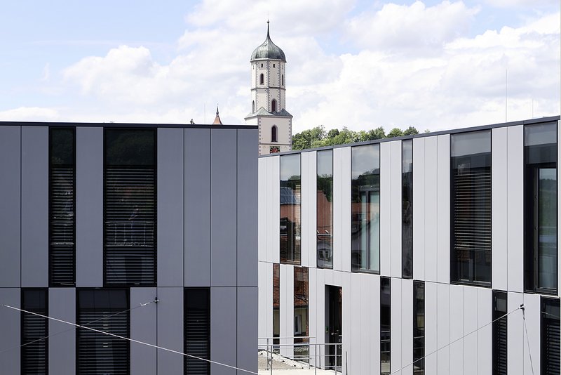 Durch die Gliederung des ganzheitlichen Baukörpers in der Horizontalen und Vertikalen werden Raumkanten der umgebenden Bebauung aufgenommen. Weiterhin wird durch die großzügige Gebäudefuge in den Obergeschossen und der Geschossstaffelung im Osten ein Übergang zur angrenzenden Bebauung geschaffen. Die vorbehandelten Zinkverbundtafeln erzeugen gemeinsam mit den Monoglasscheiben eine flächenbündige Fassade, durch die eine homogene offene Architektur entsteht. Diese fügt sich als ganzheitlicher Baukörper in den Stadtraum ein und steht im Dialog mit dem Bestand der Sparkasse.