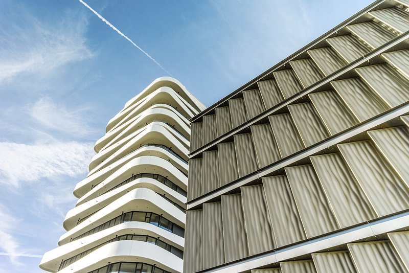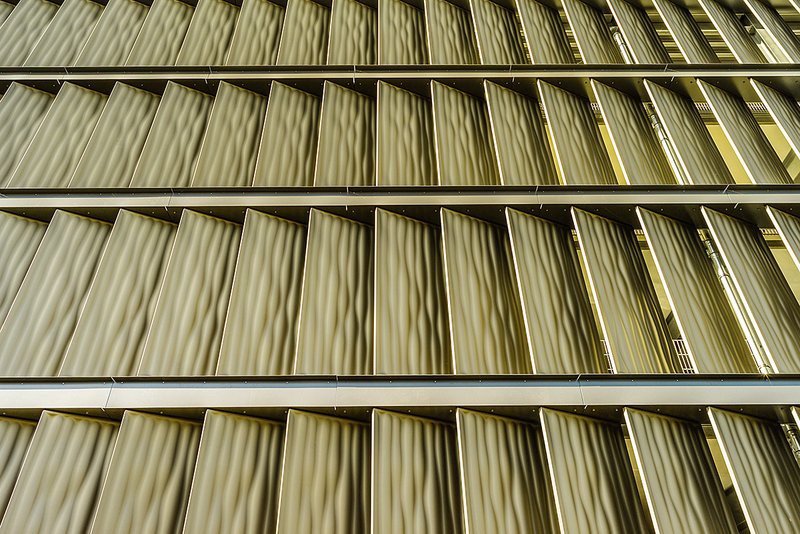 Für eine sichere Aufbewahrung der Fahrräder wurde das Sockelgeschoss mit Gitterrosten eingehaust, die darüber liegenden Parkebenen sind mit profilierten Fassadenblechen verkleidet. Die schräg stehenden Bleche verhindern unattraktive Einblicke auf gestapelte "Autokolonnen", ermöglichen im Inneren jedoch eine natürliche Belichtung und Belüftung. Trotz der homogenen Außenwirkung sind die Parkebenen im Inneren hell und durchlässig. Durch die Profilierung der Bleche ergeben sich je nach Sonnenstand und Lichtverhältnis vielfältige Farbschattierungen. Die Geschossdecken wurden durch gekantete Bleche mit tiefer Schattenfuge betont. Durch jene horizontale Gliederung bleibt die Geschossigkeit trotz homogener Fassade ablesbar. Zwischen den Fassadenblechen angebrachte LED-Leuchten ermöglichen bei Nacht farblich wechselnde Beleuchtungsvarianten.