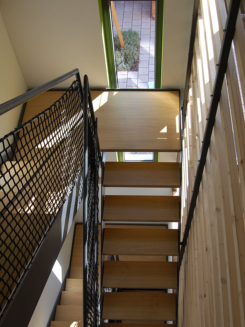 Die Brandwand zur Nachbarin wurde im Innern des Hauses so genutzt, dass dort angefertigte Möbelstücke mit viel Stauraum stehen, und so die Räume wie z.B. Schlafzimmer oder Bad kleiner gehalten werden konnten. Aus den Fenstern im Obergeschoss kann man blicken, wenn man in der Badewanne sitzt oder im Schlafzimmer im Bett liegt.